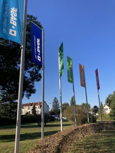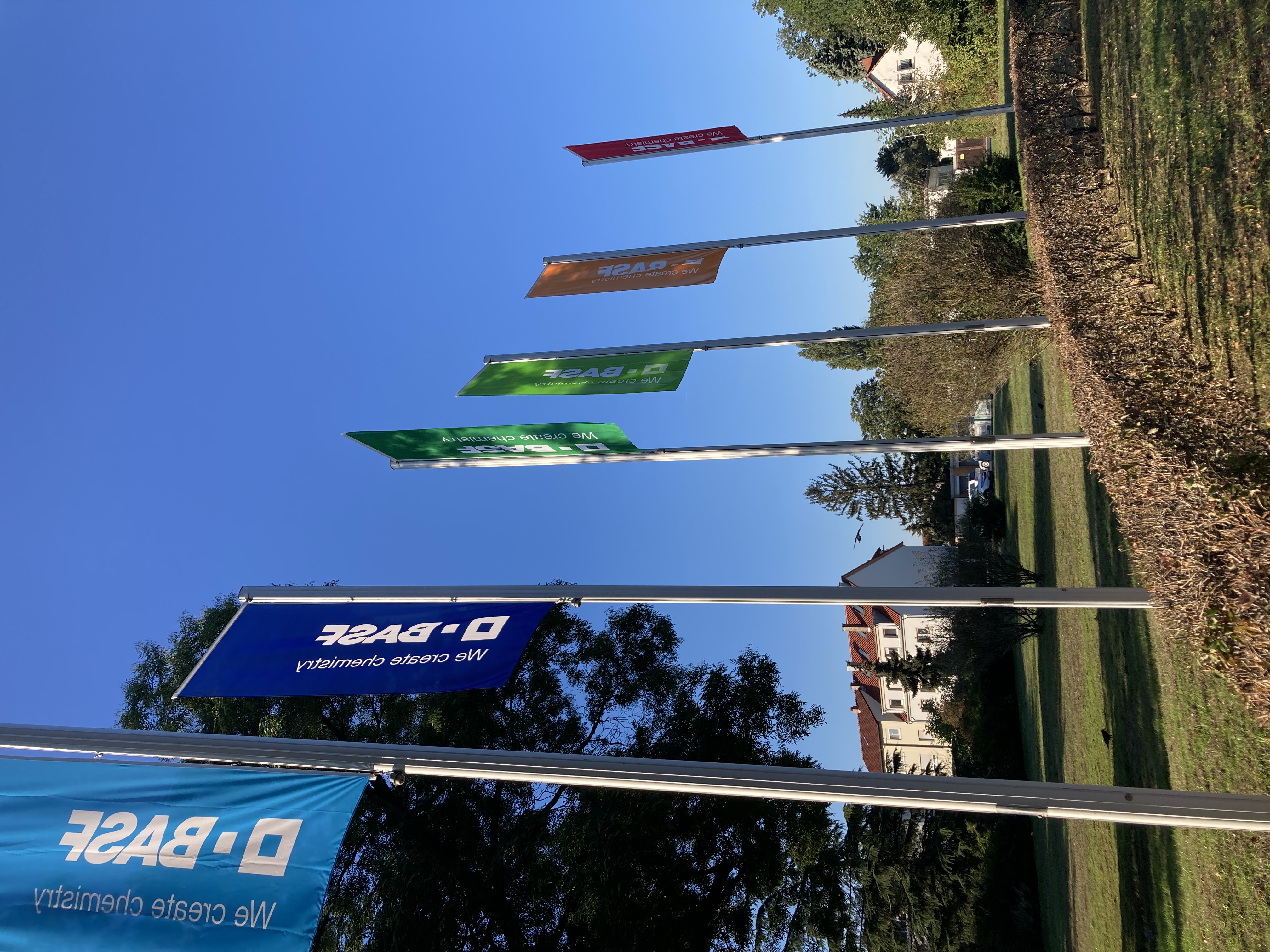 „We create Chemistry“ hört sich harmlos an und sieht fröhlich aus auf den Fähnchen. Dennoch bestimmt der Konzern das Erscheinungsbild einer ganzen Region.
