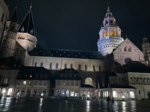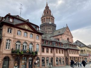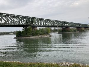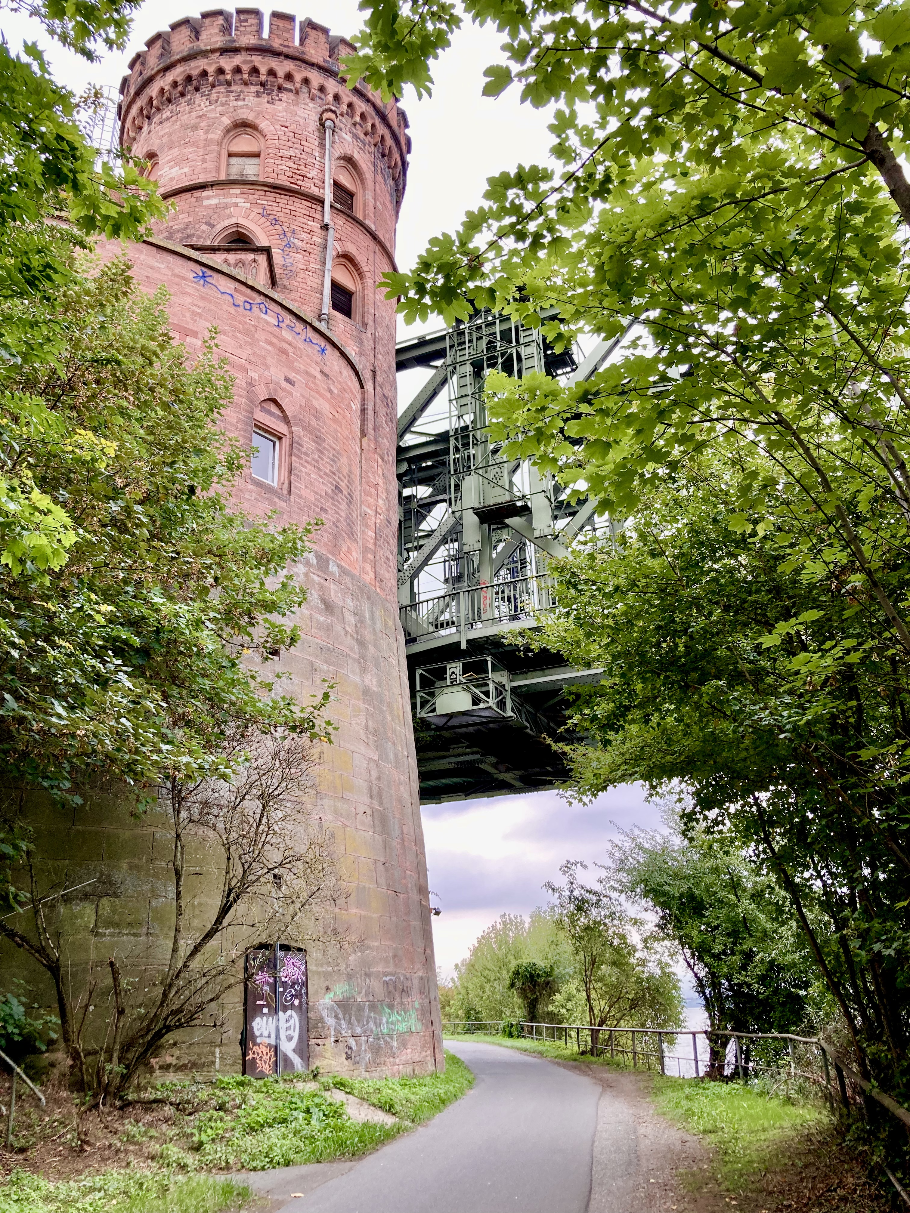 Als ich endlich wieder am Rhein bin, sehe ich schon in der Ferne Mainz. Ich staune über den Brückenträger der Eisenbahnbrücke , der wie ein Rapunzelturm aussieht.