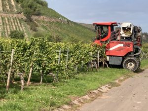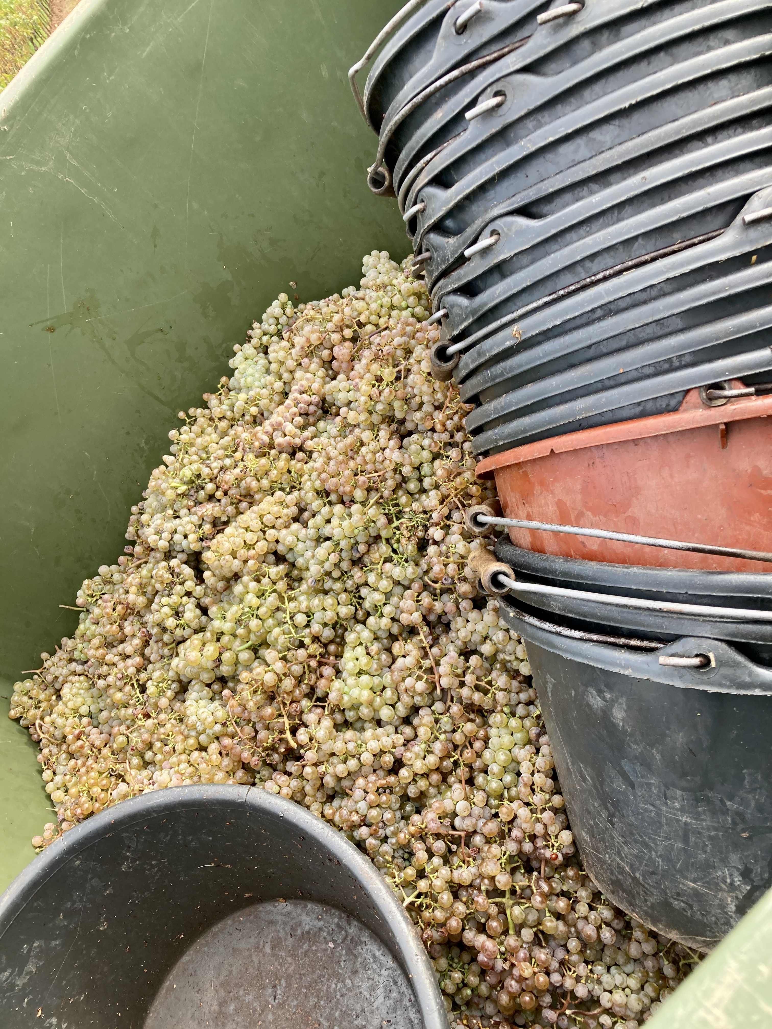 Und dann geht es erneut durch die Weinberge: ich sehe wieder eine Erntemaschine, aber endlich auch Menschen, die Trauben pflücken und damit Eimer befüllen. Hier liefert der Blick in einen Anhänger den Beweis.