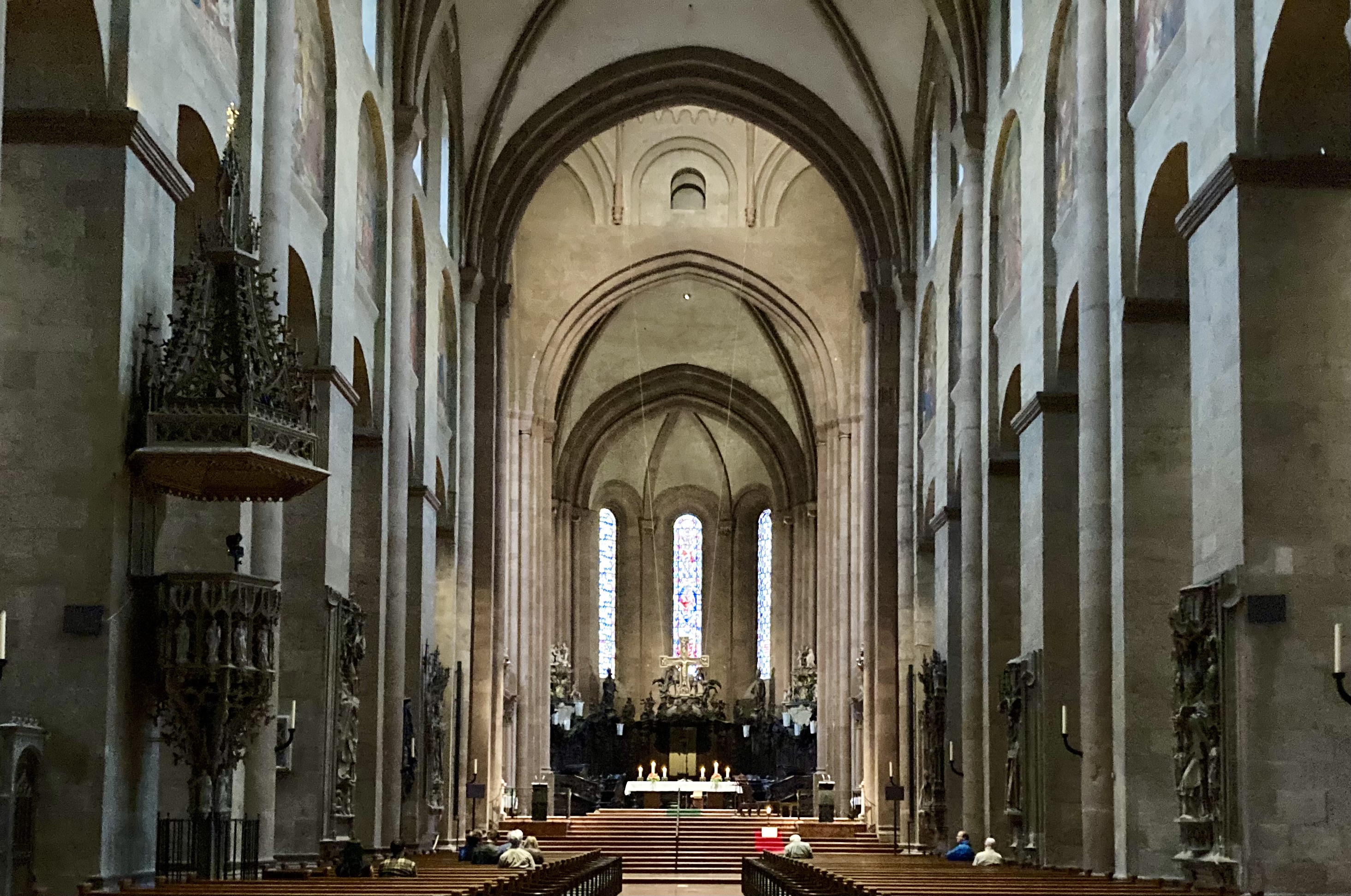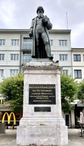 Bevor ich meine Wanderung fortsetze, möchte ich noch weitere Sehenswürdigkeiten von Mainz erkunden. Aber Sonntag Morgen ist aber kein so guter Zeitpunkt für Kirchen. In den Dom darf ich nur ganz kurz und die Chagall-Bilder in St. Stephan bleiben mir verwehrt, da Gottesdienst ist. Dann fotografiere ich halt nur Gutenberg, sein Museum und das Theater.
