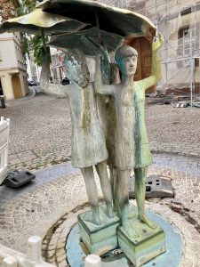 Die drei haben Schirme, ich muss wieder die Regenjacke rauskamen und Gustav verpacken. Natürlich nieselt es nicht lange, aber wir bleiben wetterfest.