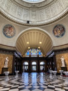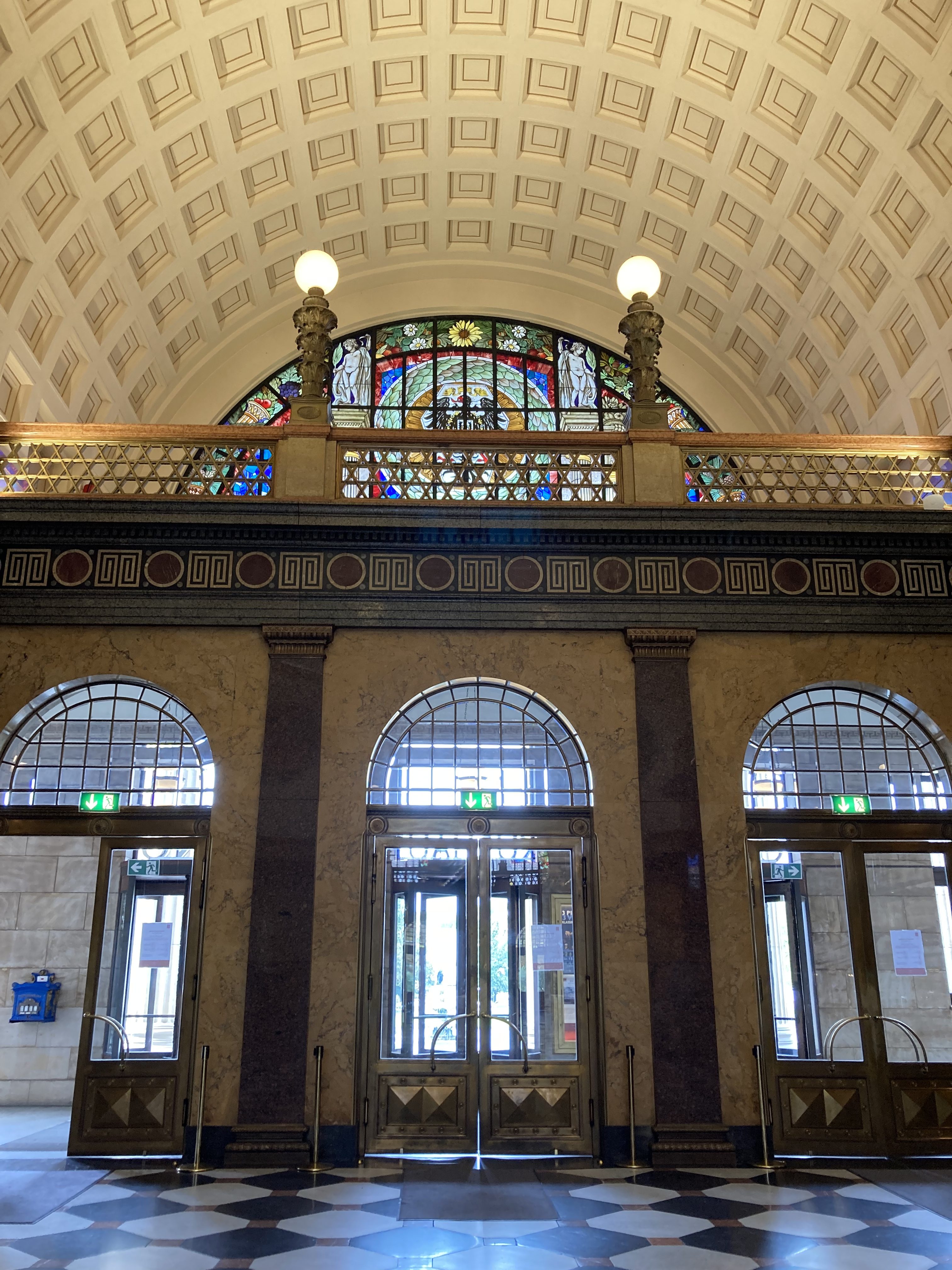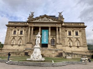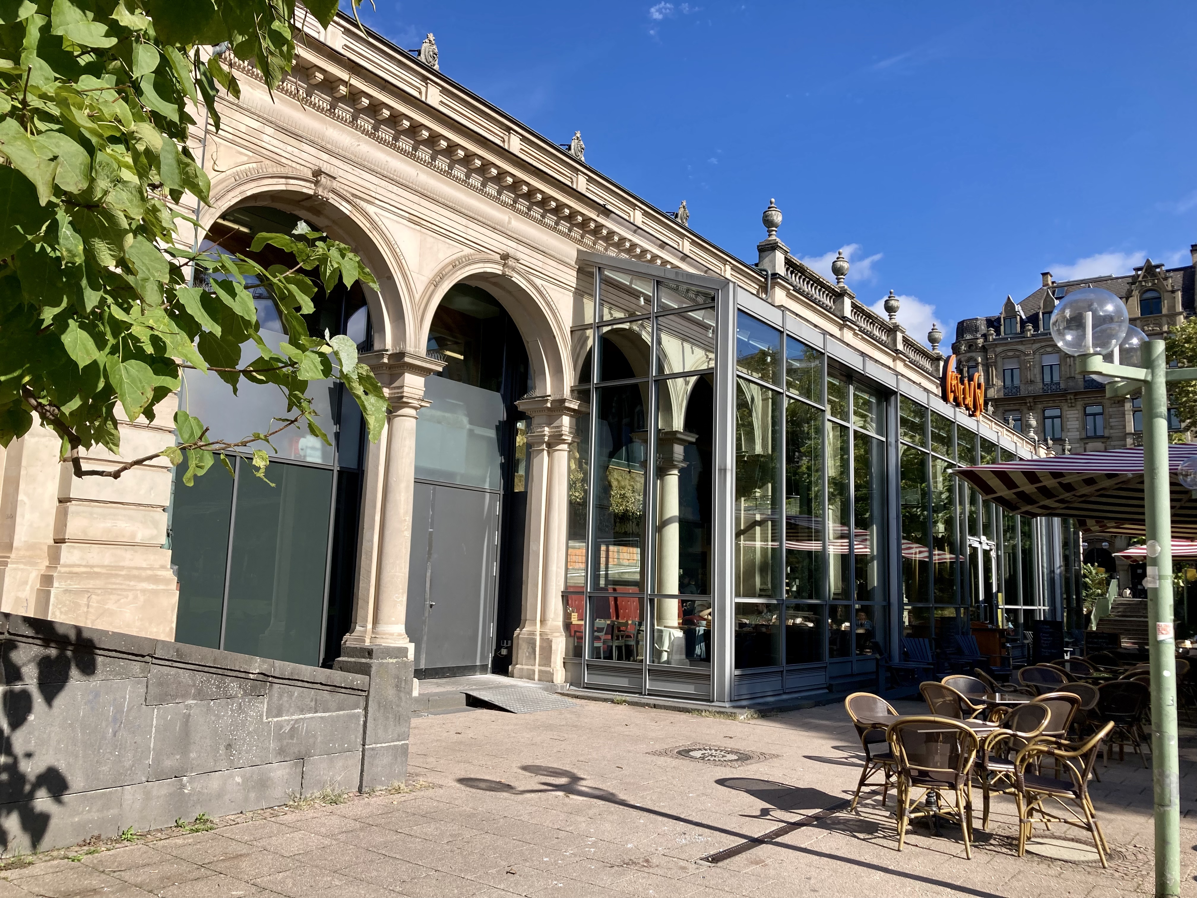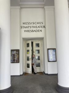 Wir kommen zum Bowling Green, der Grünanlage vor dem Kurhaus, und Gabi erzählt mir traurig, dass dessen prachtvolle alte Platanen vor einigen Jahren dem Bau einer Tiefgarage zum Opfer gefallen sind. Auf dem Weg zum Kurhaus schauen wir kurz ins Hessische Staatstheater rein.