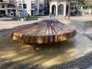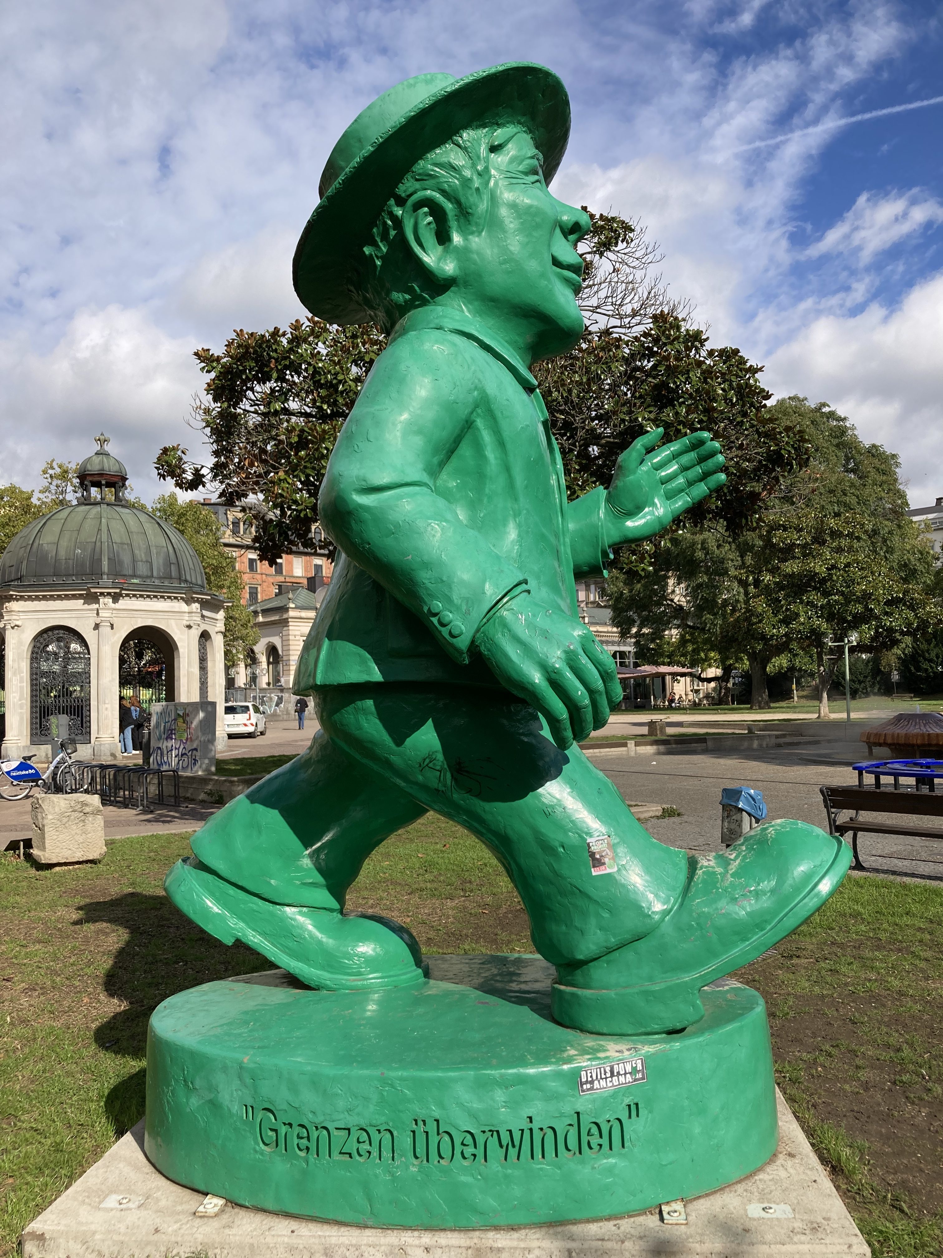 Daneben bewundere ich den „Kochbrunnenspringer“, dem auch übelriechendes Wasser entspring. Kleine Wolken bilden sich dabei, die auf dem Foto nur ganz vage zu erkennen sind. Dann drehe ich mich auf dem Kochbrunnenplatz um und begegne zum ersten Mal persönlich einem Ampelmännchen. Diese Figur wurde anlässlich der 25-jährigen Deutschen Einheit aufgestellt.