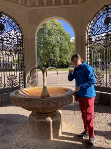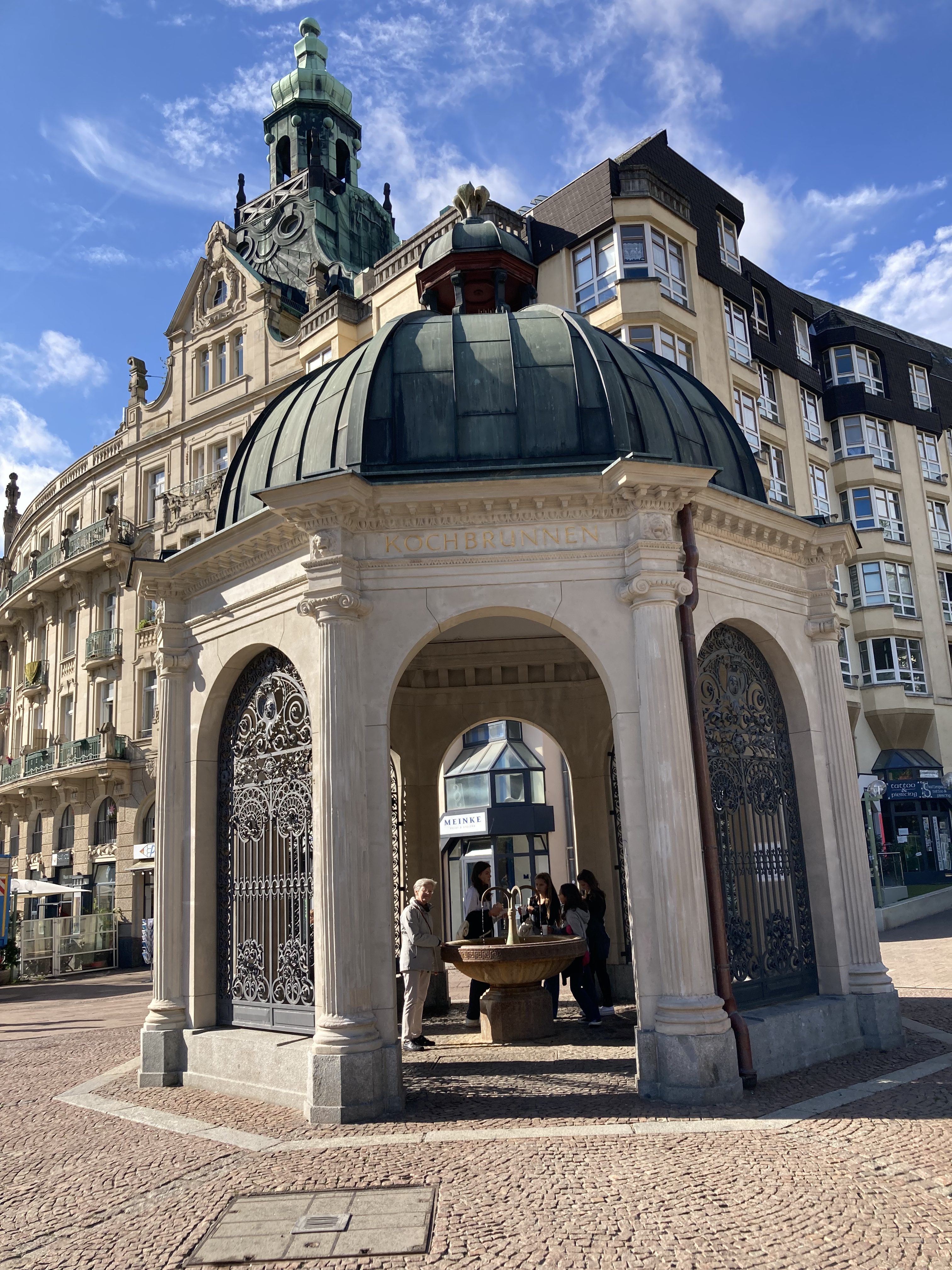 Wir beginnen am Spital und gehen weiter zum Kochbrunnen, aus dem fast 70° heißes schwefelhaltiges Wasser fließt, dem Wasser, das die Stadt einst zur mondänen Kurstadt machte. Diese zog zu bestimmten Zeiten Reiche aus aller Welt – häufig auch aus Russland – an, die sich wegen der heißen Quellen beispielsweise Heilung oder Linderung ihrer Lungenkrankheiten versprachen. Sie wohnten während ihres Aufenthalts in luxuriösen Hotels. Leider konnten nicht alle Gäste gesund wieder nach Hause fahren, sondern einige verstarben sogar in Wiesbaden.