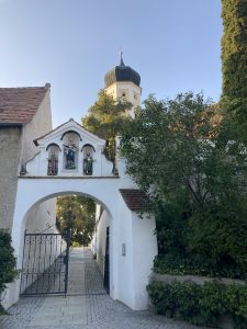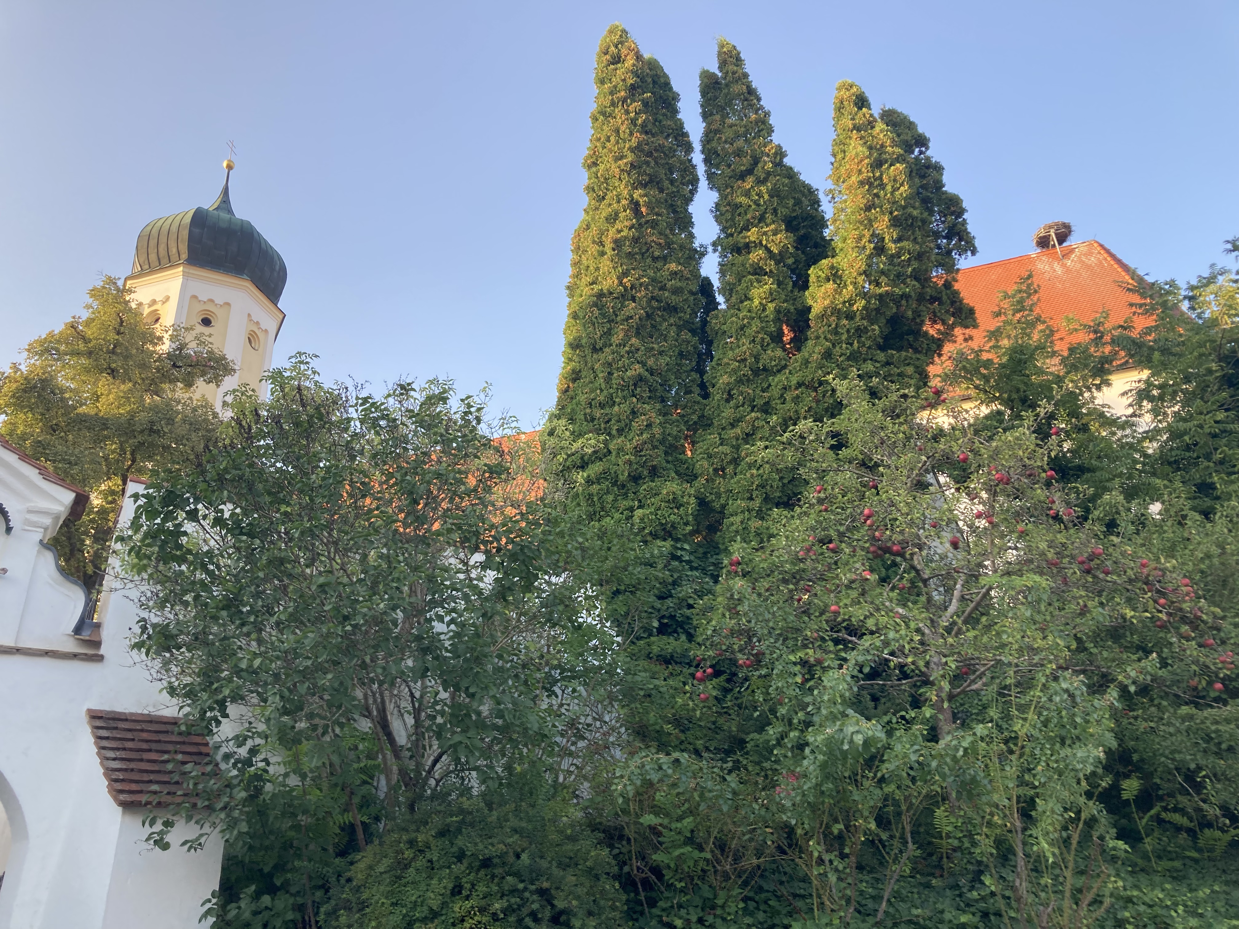 Die Kirche von Burgheim liegt malerische in der Abendsonne.