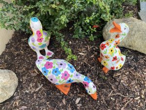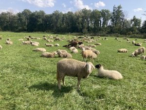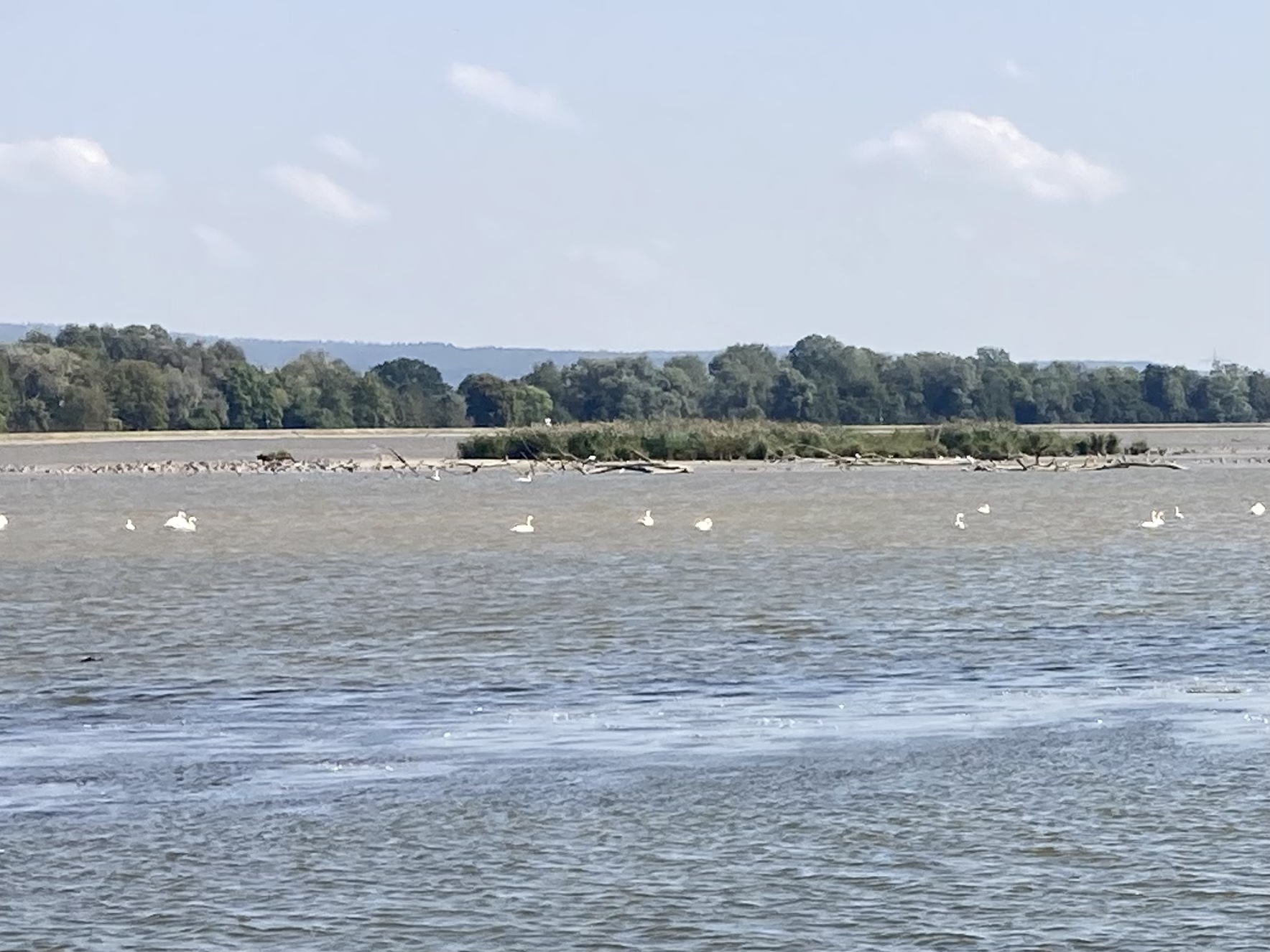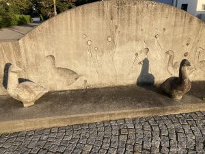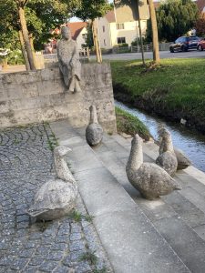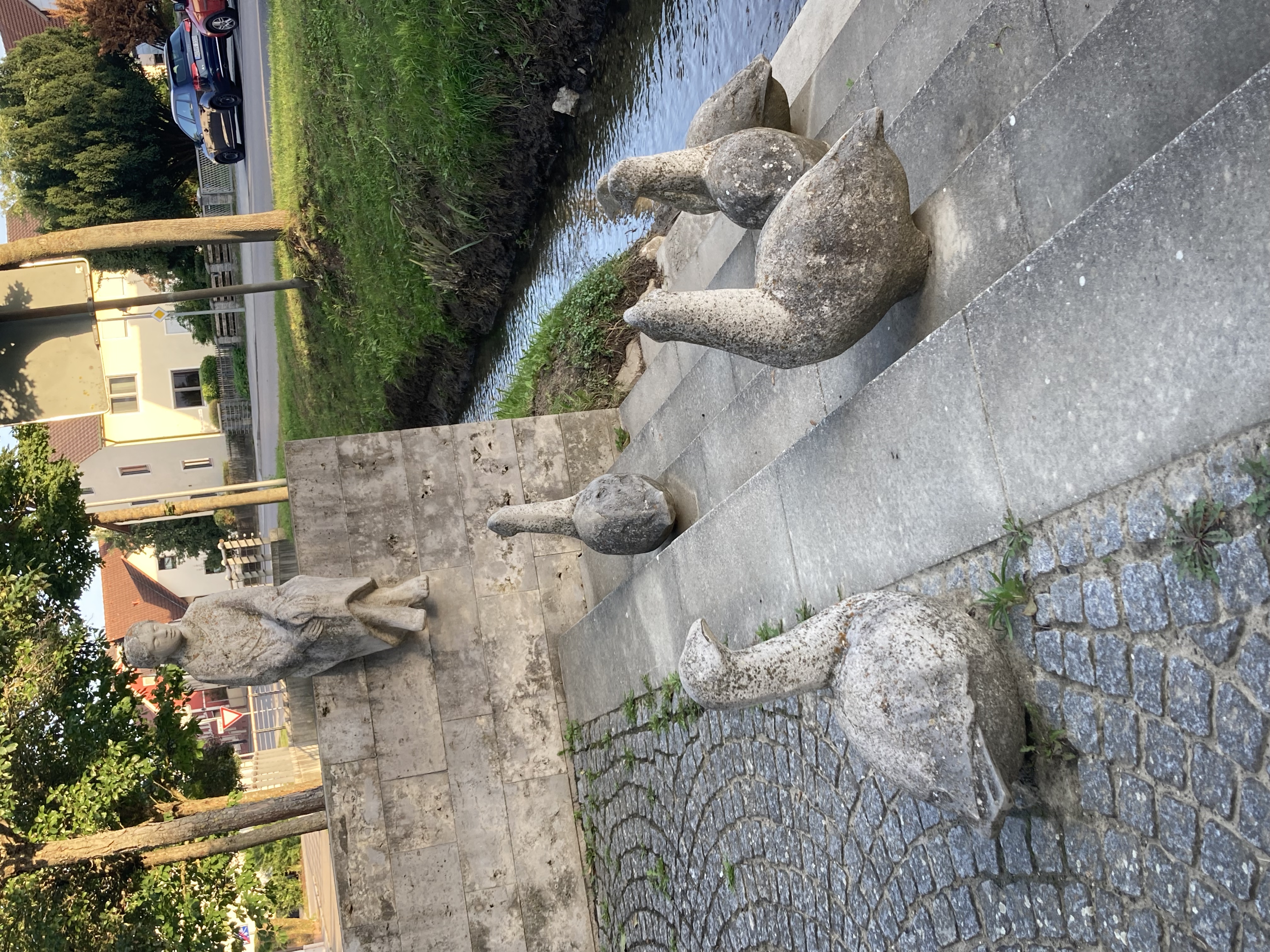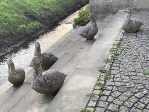 Die Steingänse erinnern mich an die Kolonie von Wildgänsen, die ich heute vor der Staustufe gesehen und gehört habe, als sich die Donau wieder zu einem halben See verbreitert hat. Ernten und Schafe konnte ich heute auch schon lebendig bewundern.