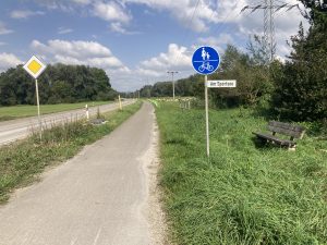 Manche Tiere schauen mir interessiert hinterher. Und dann taucht das erste Bänkchen des Tages auf. Es hätte wahrlich schönere Plätzchen gegeben… Aber ich bin heute nicht fit und halte ein kurzes Nickerchen trotz Straße und benachbartem Kieswerk.