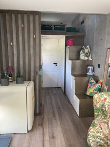 Ich schaue genau hin und entdecke es oben über dem Bad. Die Möbel rechts sind Stufen, hohe Stufen. Ohje, wie wird das heute Nacht werden, wenn ich raus muss?