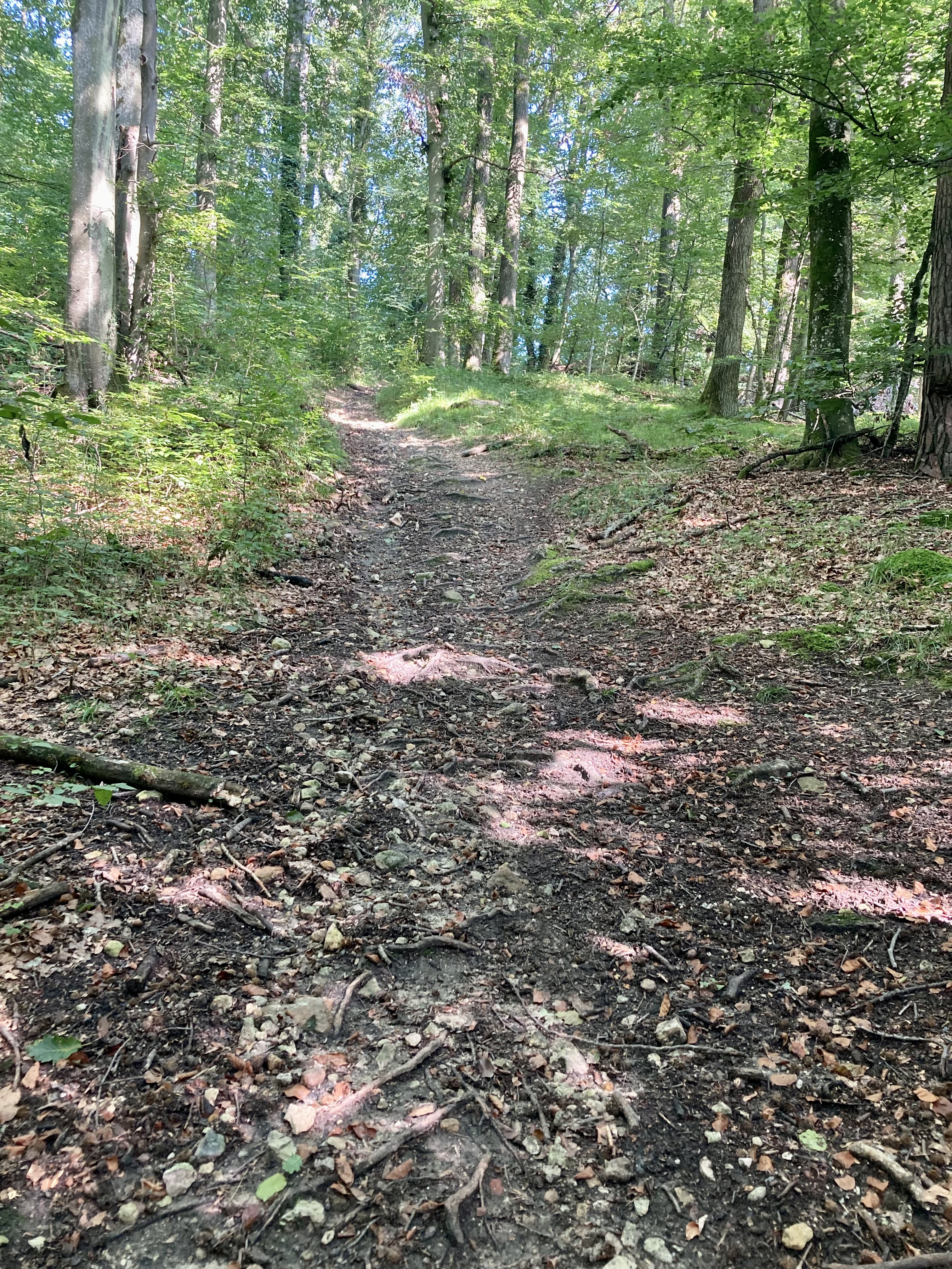 Das darf doch nicht wahr sein! Nur noch ein paar hundert Meter und der Weg führt so steil nach oben, dass ich Angst bekomme. Die Spur ist vom Regen ausgewaschen und meine Füße sind müde. Sonderlich trittsicher bin ich sowieso nicht. Eigentlich sollte ich jetzt die Stöcke rauskamen, aber dazu bin ich zu faul. Also geht es vorsichtig Zentimeter um Zentimeter langsam aber stetig hinauf. Alles geht gut, das Drama bleibt aus. Ich erreiche Neuburg unbeschadet und beziehe ein luxuriöses Hotelzimmer. Dort lege ich Gustav ab, richte mich ein wenig und watschle zum Bahnhof, denn…