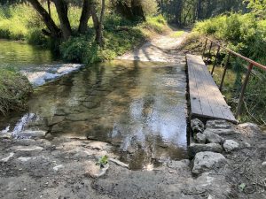 Der Grasweg am Fluss führt entlang des Naturwalds der Stiftung „Naturerbe Donau“ und mündet in einen Waldweg, über den planmäßig ein Bach fließt, unpassierbar für normale Fahrzeuge. Für Fußgänger gibt es glücklicherweise einen „Gehweg“.