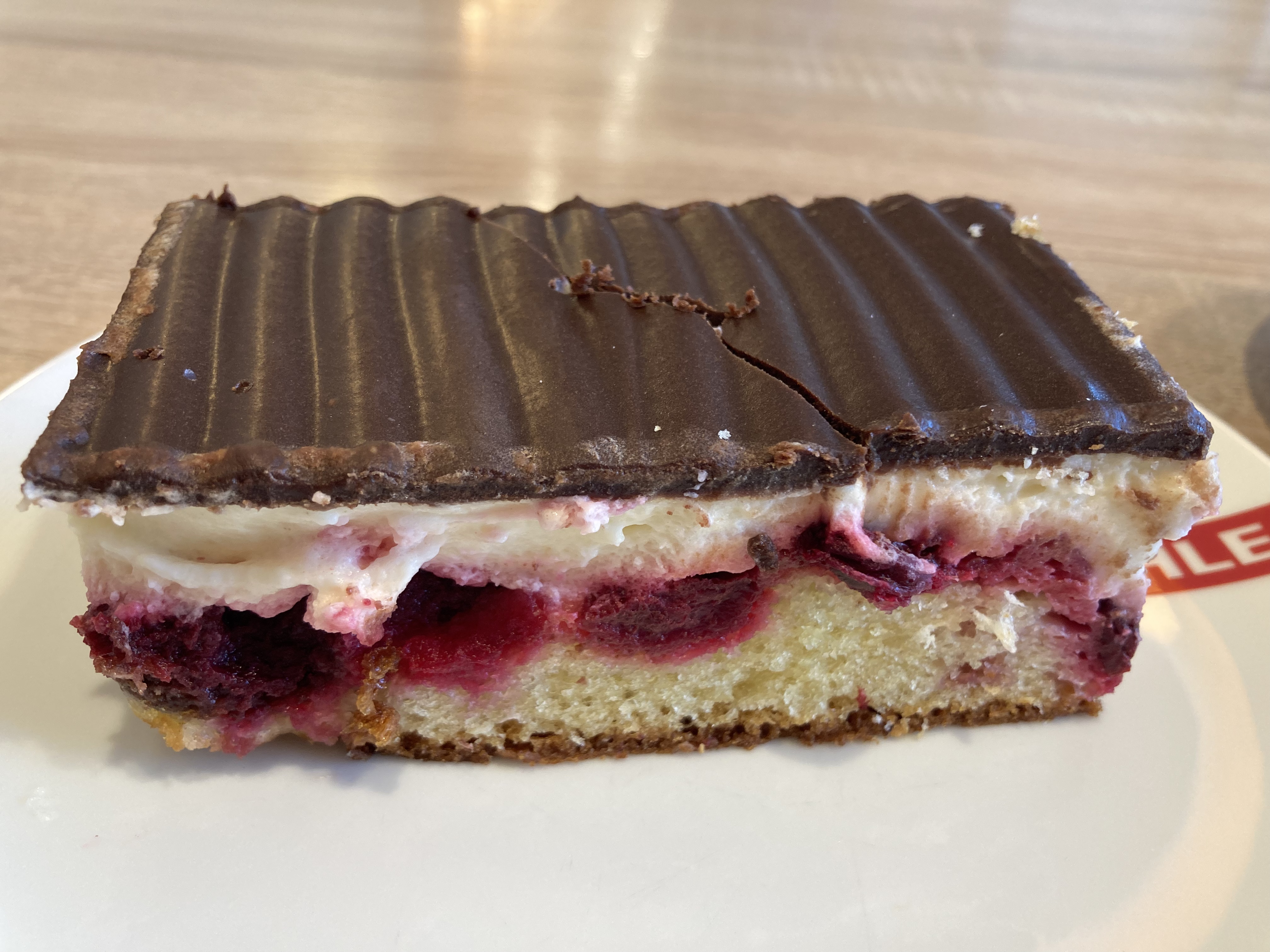 Zum Frühstück trinke ich noch einmal Cappuccino beim REWE und genieße eine Donauwelle. Wenn das mal kein gelungener Start für meine heutige Donauwanderung ist!