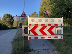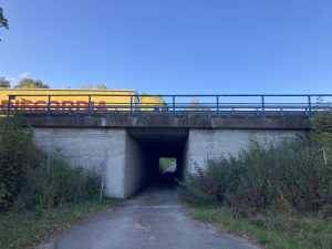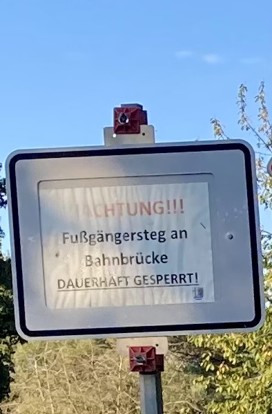 Ich bin frustriert auf dem Weg zur nächsten Brücke, mindestens zwei Kilometer Umweg. Doch sicherheitshalber erkundigen ich mich noch bei einem jungen Jogger, ob diese Brücke wenigstens passierbar ist. „Sie können schon die Bahnbrücke nehmen, da wurde ein neuer Steg auf der anderen Seite gebaut.“ Ich bin erleichtert. Aber meiner Meinung nach, hätte das auch auf dem Schild an der Sperrung stehen können!