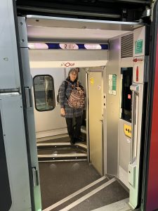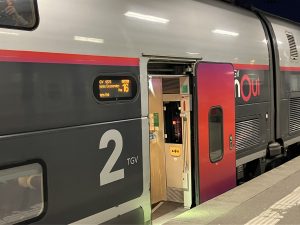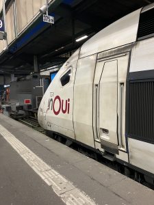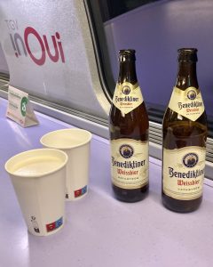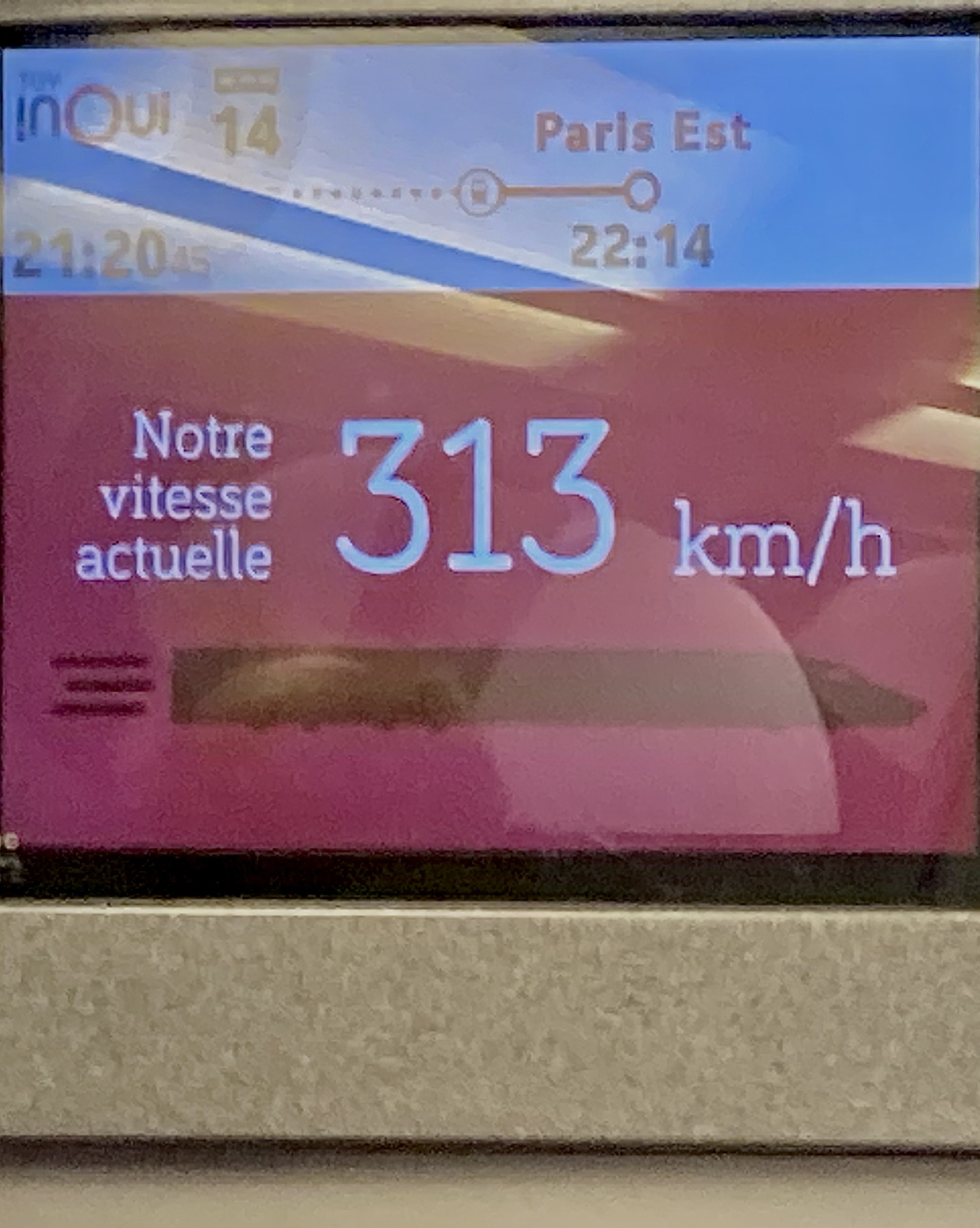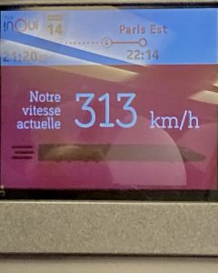 „Ich will nicht in die Nacht hinein fahren!“ sagt Konrad. Ja, wir sehen nicht viel von unserer Fahrt nach Paris. Im Speisewagen vertreiben wir uns die Zeit hinter unseren Weizenbier im Pappbecher. Wir halten dabei die Geschwindigkeitsanzeige im Auge: 318 km/h wird nicht überboten. Wir unterhalten uns dabei über die Umrechnung von Fahrenheit in Celsius oder amerikanische Geschichte, Vorbereitung auf das, was noch kommt also.