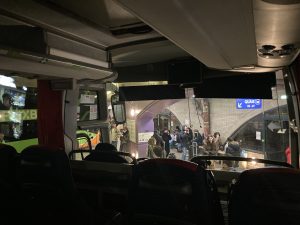 Wir holen unser Gepäck im Hotel ab und bewegen uns langsam in Richtung Quay de Bercy, wo unser Bus um 22:00h abfahren wird. Gut, dass wir noch genug Zeit haben, denn es warten noch Herausforderungen auf uns: beispielsweise der Kauf der Metro-Tickets und der Weg zum Busbahnhof, der sich in einer Art unterirdischer Riesen-Garage befindet. Unser Routenplaner führt uns zwar problemlos auf das Dach dieser Garage, aber um den Eingang zu finden, brauchen wir neben Pfadfindergeist auch ein gehöriges Maß an Ausdauer.