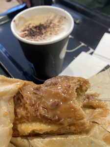 „Weißt du noch, wie schwer es vor drei Jahren war ein Café zu finden, in dem ich ein Eclair essen konnte?“ (In Frankreich möchte ich nämlich immer ein Eclair haben!) Wir wiederholten das Spiel. Uns ergeht es ähnlich wie damals, bis wir bei einer Bäckereikette namens „Paul“ landen. Ein einziges Karamell-Eclair lacht mich an, aber dieses Individuum stellt mich völlig zufrieden, wenngleich ich lieber Geschirr gehabt hätte.
