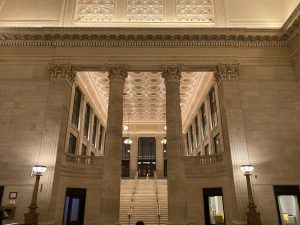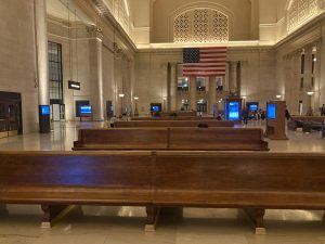 Konrad hat in weiser Voraussicht ein Zimmer in der Nähe des Flughafens gebucht. Dort sollen wir am Donnerstag von einem Bus abgeholt werden, der uns zur Firma Coachmen und somit zum Wohnmobil bringen wird, das wir dann nach Las Vegas überführen wollen. Wir laufen zwei mal den selben Weg zur richtigen Metro Station. Wie ärgerlich, aber wir kommen dadurch an der prächtigen Union Station von 1925 vorbei, die mehr an eine Kathedrale als an einen Bahnhof erinnert.