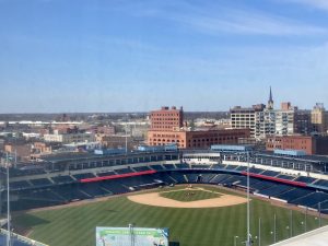 Wir blicken von unserem Hotelzimmer auf das Stadion der Mud Hens. Es ist genug Zeit, wir dürfen noch bis zum frühen Nachmittag bleiben. Ein Super-Late-Checkout…Wieder eine freundliche Dame an der Rezeption, thank you!