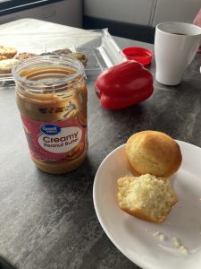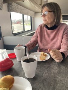 Ach, wie ist das aufregend, trotz aller Kälte! Zum ersten Mal meilenfressend über die riesige Highways „roadtrippen“! Unser Frühstück, das erste Picknick!