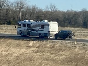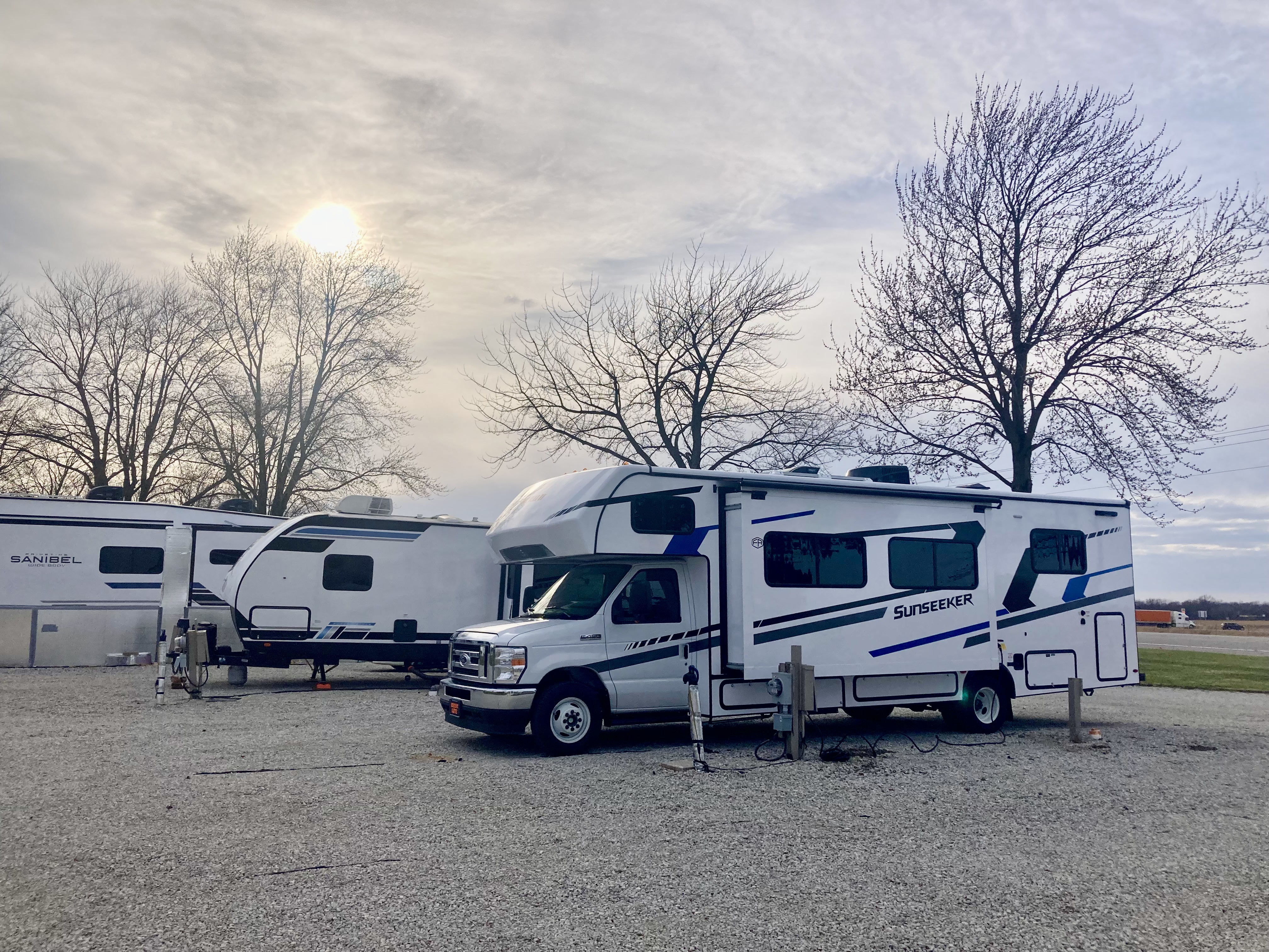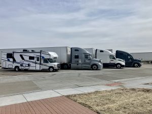 Hoffentlich bekommt unser RV keine Minderwertigkeitskomplexe neben den ganzen anderen: nur ein einziges Slide-Out und das noch ohne Fenster; kein Jeep mit Fahrrädern, den wir hinterher ziehen…