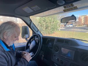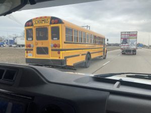 Gemächlich aber unaufhaltsam kommen wir voran, Richtung Südwesten. Konrad, der Fahrer, bleibt gelassen, auch wenn wir immer wieder von Profi-Truckern überholt werden. Selbst der heftige Wind bringt ihn nicht aus der Ruhe.