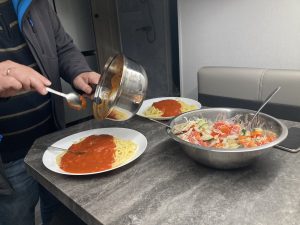 Konrad probiert die gut ausgestattete Küche aus. Unser Bedürfnis nach Vitaminen findet mit einer großen Schüssel gemischten Salat seine Erfüllung.