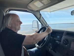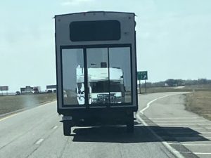 Wir sehen ihm während der Fahrt zu, als er sich im vorderen Fahrzeug spiegelt.