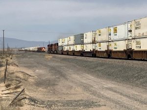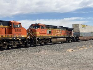 Westlich des Mississippis teilen sich die beiden Eisenbahngesellschaften Union Pacific und BNSF Railway, die jeweils über ein Streckennetz von über 30 000 Meilen verfügen, den Güterverkehr auf der Schiene. Wenn man sich die endlose Kolonne von Trucks ins Gedächtnis ruft, die uns in den letzten 10 Tagen auf den verschiedenen Interstates überholt haben, erscheint es recht überraschend, dass die USA einen sehr viel größeren Anteil ihrer Güter auf der Schiene transportieren, als das etwa in Europa oder Deutschland der Fall ist. Dies liegt natürlich auch daran, dass es nur sehr wenige Personenzüge gibt, die durch relativ langsam fahrende Güterzüge ausgebremst werden und bei den großen Entfernungen der Aufwand für die Bahnverladung weniger ins Gewicht fällt.