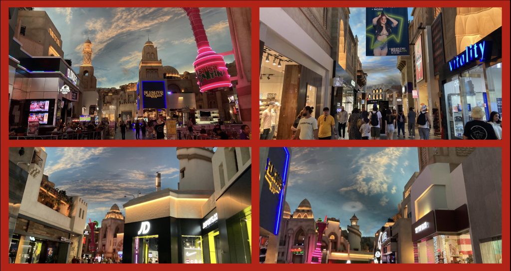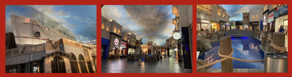 Ah, so sieht sie in Wirklichkeit aus, diese Illusion einer orientalischen Stadt unter freiem Himmel… Fotografieren macht zwar Spaß, aber wir sind noch zu sehr an die echte Schönheit gewöhnt, die unter freiem Himmel möglich ist. Großartiges Staunen bleibt aus. Außerdem frieren wir fast, obwohl es heute eigentlich 36°C heiß ist. Alles ist runter gekühlt. Dieser Energie- und Wasserverbrauch mitten in der Wüste schockt, obwohl uns das ja alles bereits bekannt war.
