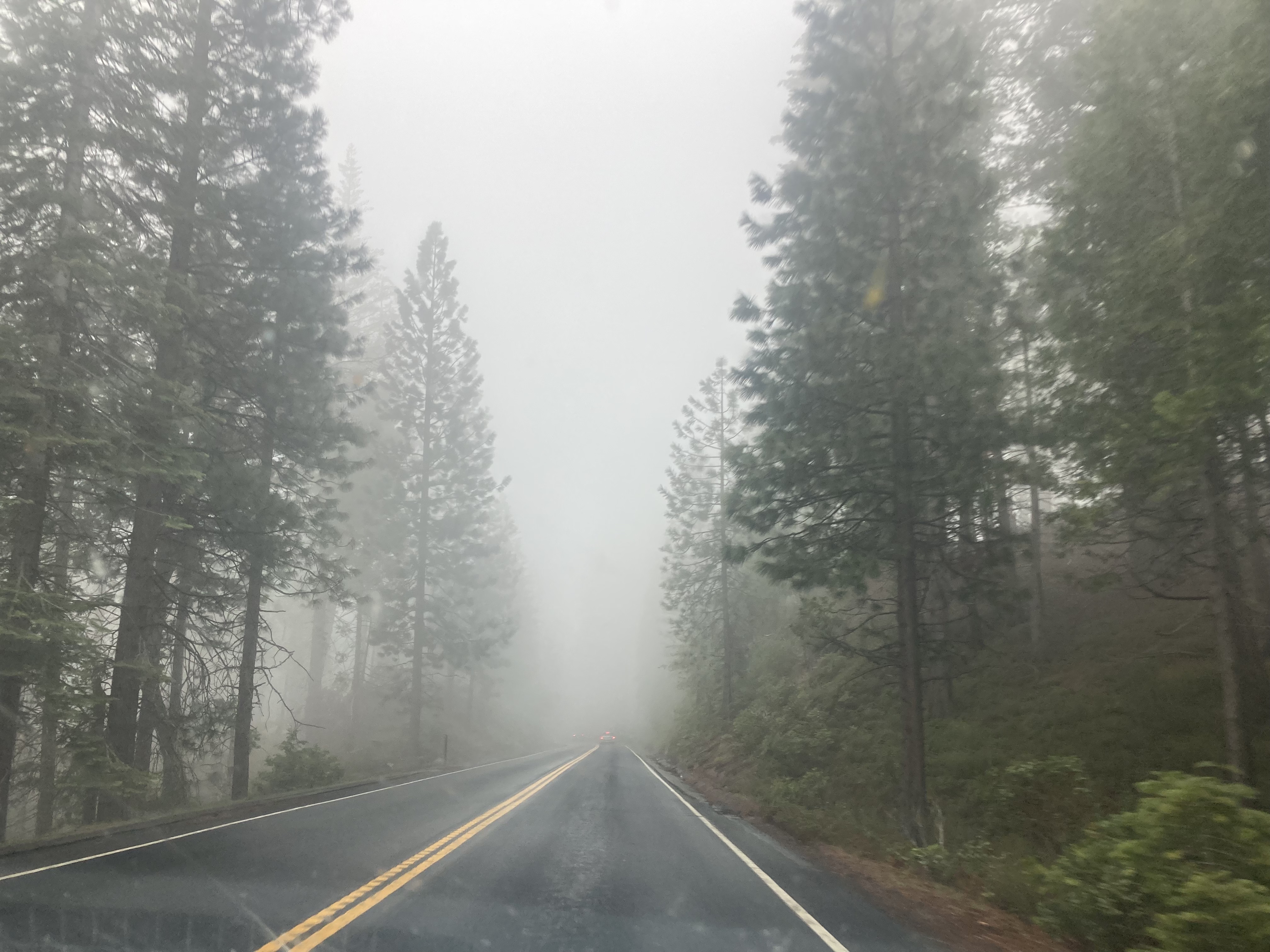 Heute droht keine Waldbrandgefahr, im Gegenteil. Es nieselt wieder. „Ist das Wetter nicht noch schlechter als gestern?“ „Der Ausflug ist sinnlos, wir können nichts sehen. Wie sollten wieder umdrehen!“ Der America the Beautiful Pass ermöglicht freien Eintritt. Viele andere fahren heute mit uns in den National Park, komisch!