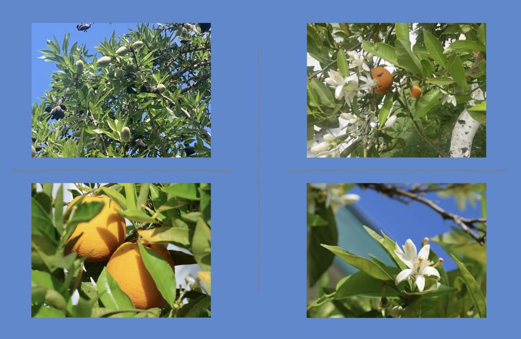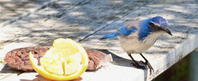 Konrad füttert einen „California Scrub Jay“ mit Orange, aber der ist mehr an den noch verpackten Mandeln interessiert.