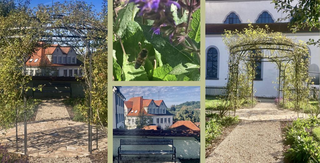 Mörike saß wohl einst in dieser (oder vermutlich ähnlichen) Laube und schrieb. Ich setze mich hier an meinem Erholungstag zum Entspannen auf die Bank und höre den summenden Bienen im Salbei zu.