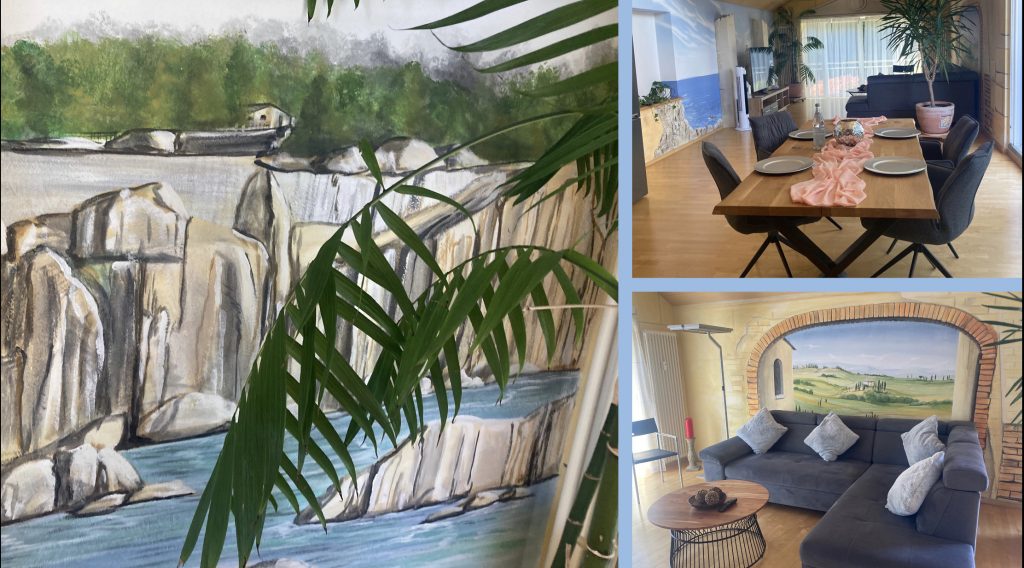 Gestaltung im Stil der Toskana! Hier hat sich jemand mit viel Liebe zum Detail verkünstelt. Durch den großzügigen Raum und die moderne Einrichtung wirkt der Kitsch nicht einmal allzu unangenehm.