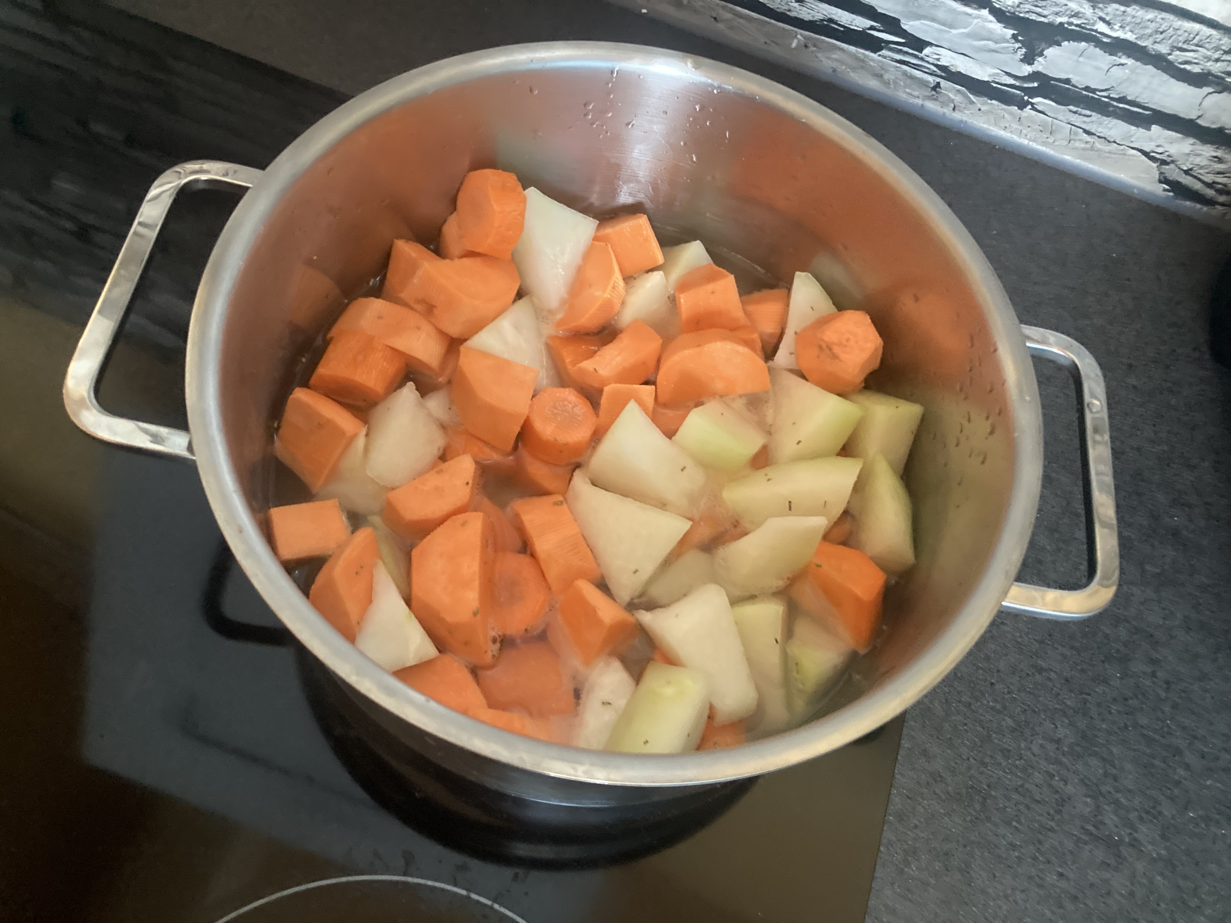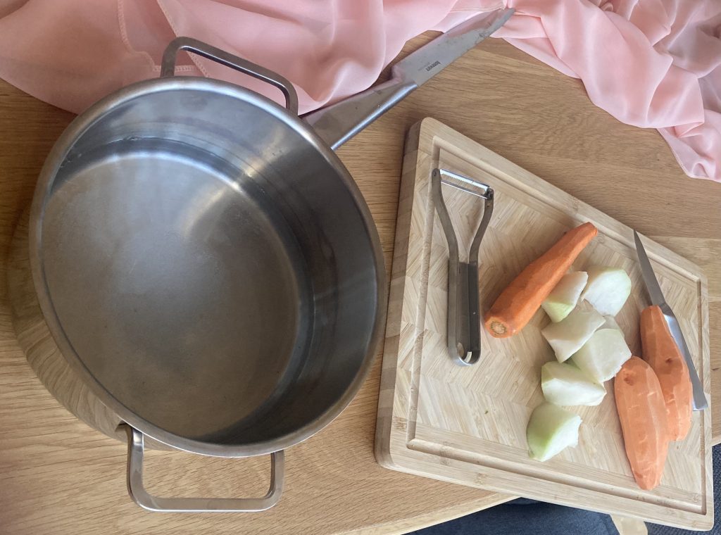 Das ist meine Beute: 2 Süßkartoffeln, 1 Kohlrabi, 1 Karotte. Und dann geht es mit Riesenschritten weiter…