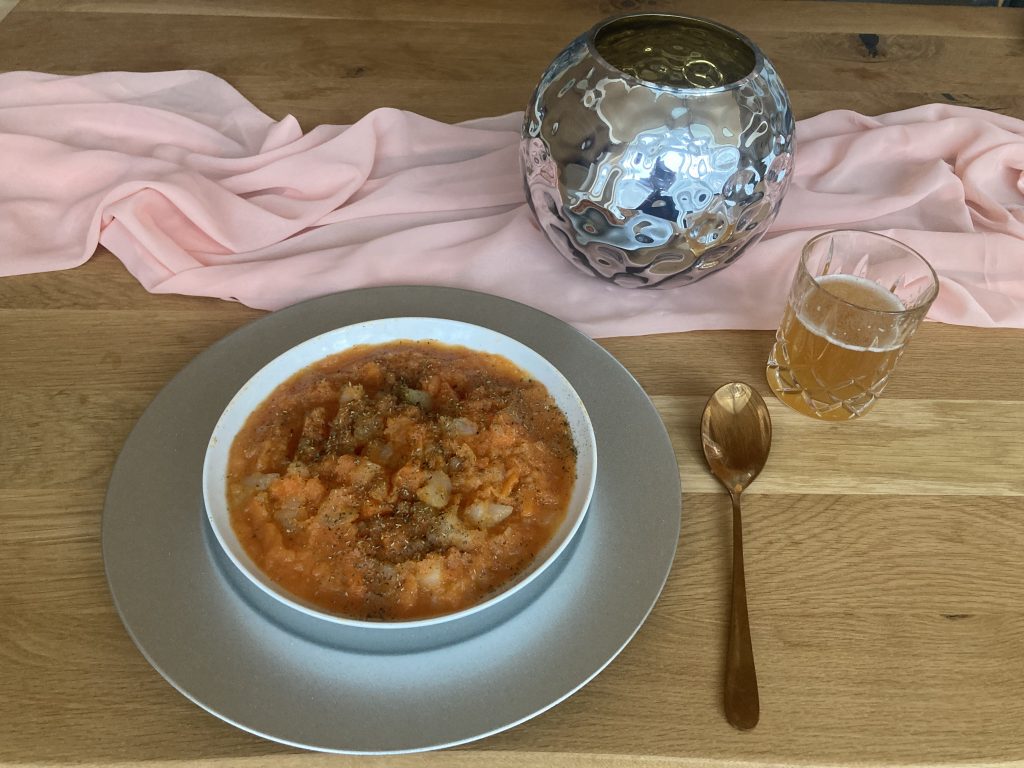 Happy End! Es schmeckt und die Größe der Portion ist genau richtig. Ich nenne das Gericht „Sche(e)rzaubertopf“. Das Rezept kann auf Anfrage nachgereicht werden.