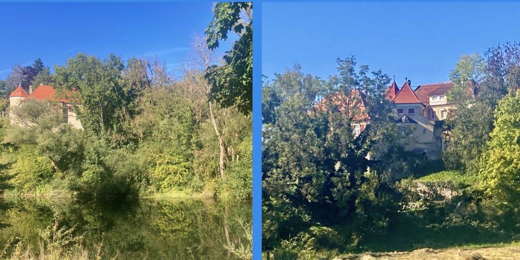Die Burg ist auch in Privatbesitz und genauso wenig zugänglich wie das Schloss. Einen passenden Weg entlang der Schleife kann ich weder rechts noch links des Flusses entdecken. Ein paar schöne Eindrücke finde ich trotzdem zum Fotografieren…