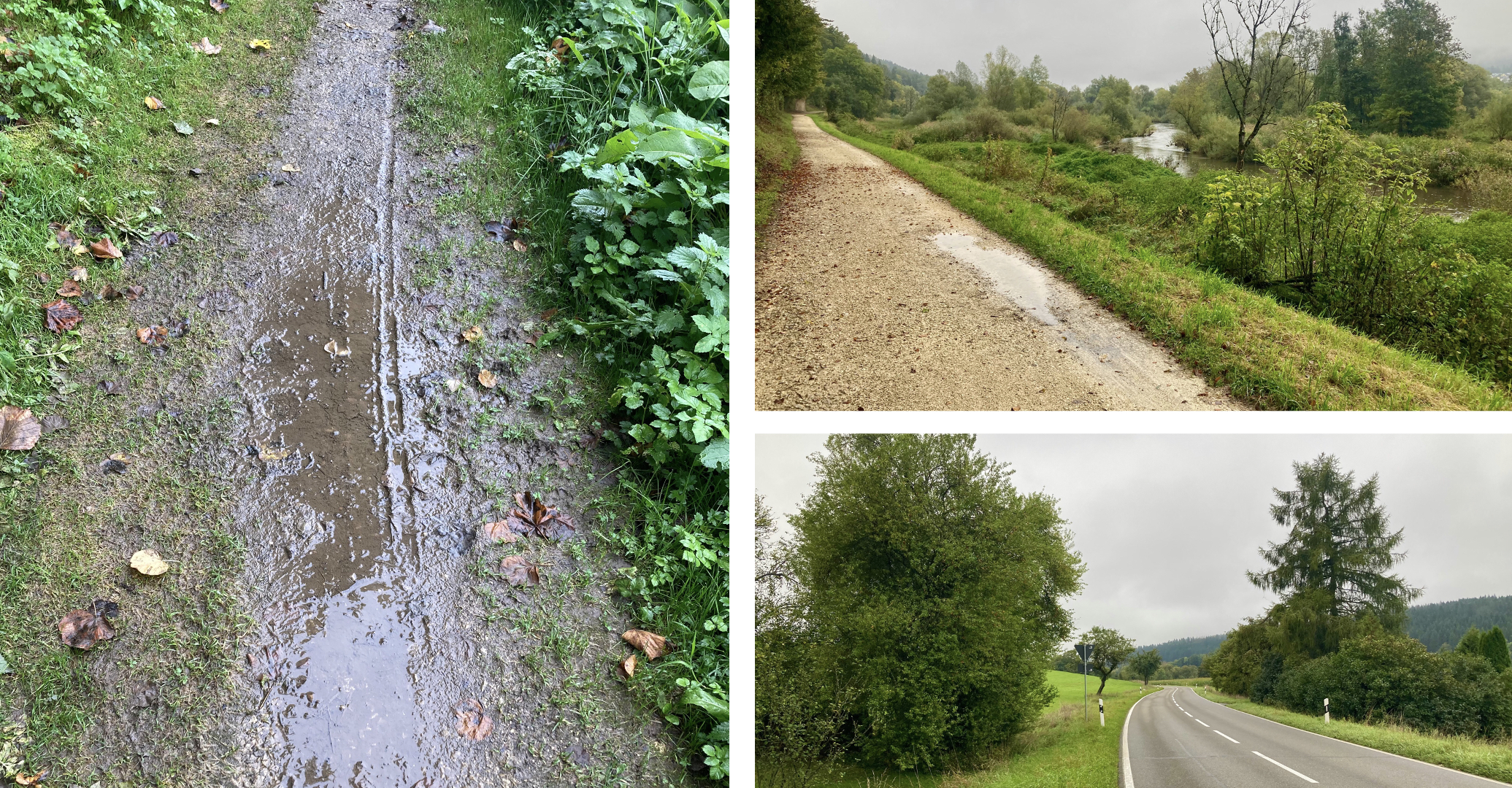 – unterschiedliche Wege: Radwege, Wanderwege, eine Straße, teilweise etwas schlammig,
