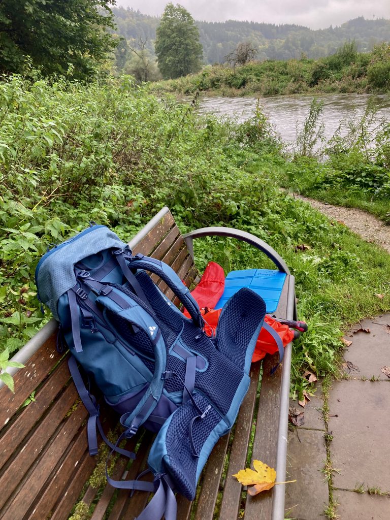 Jetzt sind die Bänkchenpausen ungemütlicher geworden. Heute krame ich sogar zum ersten Mal mein Styropor-Sitzkissen hervor, um mich vor der Feuchtigkeit zu schützen. Bei 10 Grad zieht es mich bald weiter. Ein warmes Getränk mit Koffein, Milchschaum und Kakaopulver wäre jetzt nicht zu verachten. In Immendingen geht mein Wunsch in Erfüllung.