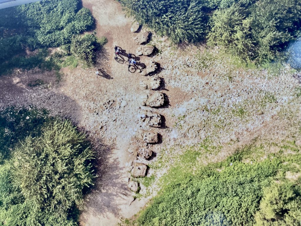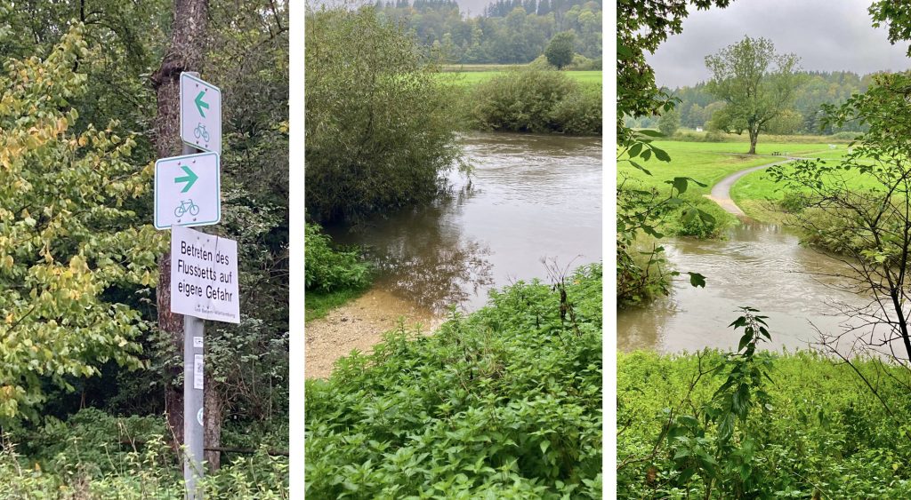 Würde ein Radfahrer der Beschilderung folgen, dann müsste er im Fluss landen, auf der anderen Seite genauso. Es wird also wirklich Tage geben, an denen das anders ist. Wieder fotografiere ich das Foto von einer Tafel.