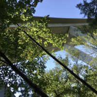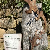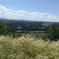 Erster Blick auf den Neckar als ich ein Stück weit auf dem Wanderweg „Hochgehblickt“ beziehungsweise auf dem Besinnungsweg Weit-Blick laufe. Ich sehe ein paar Stationen z.B. „Die Mauer“.