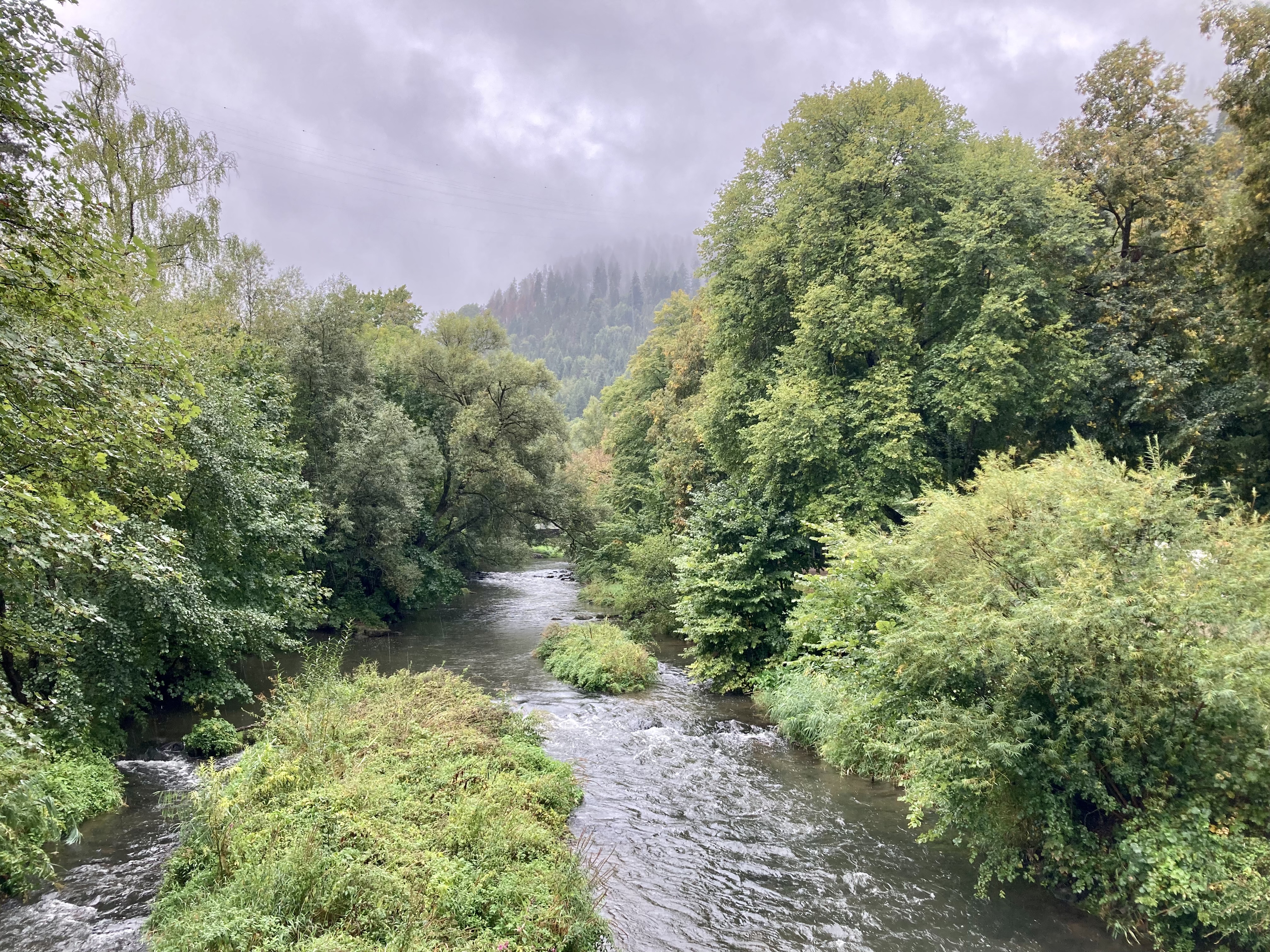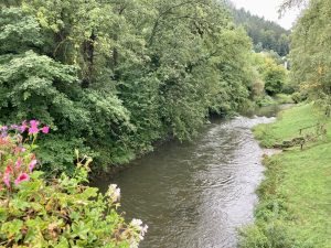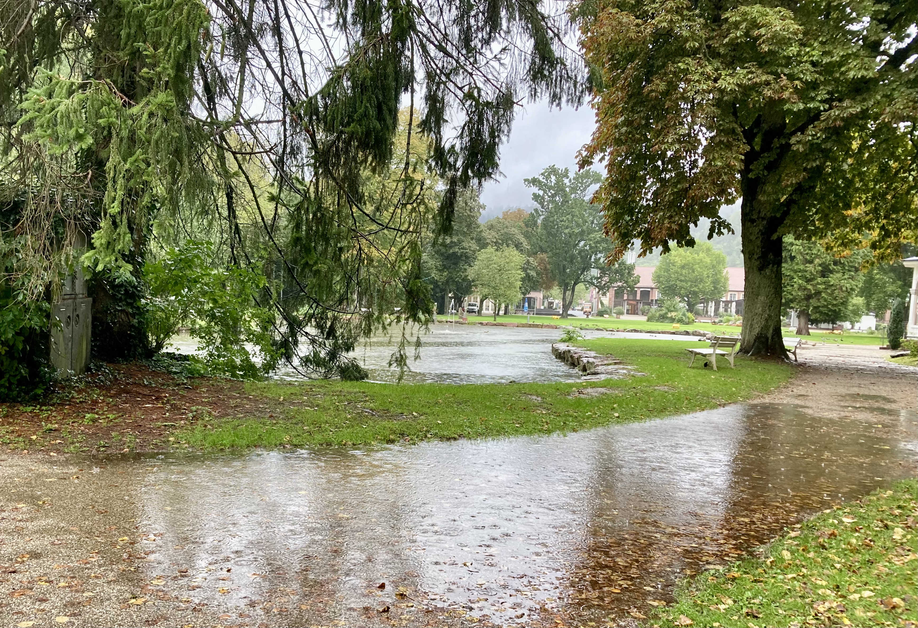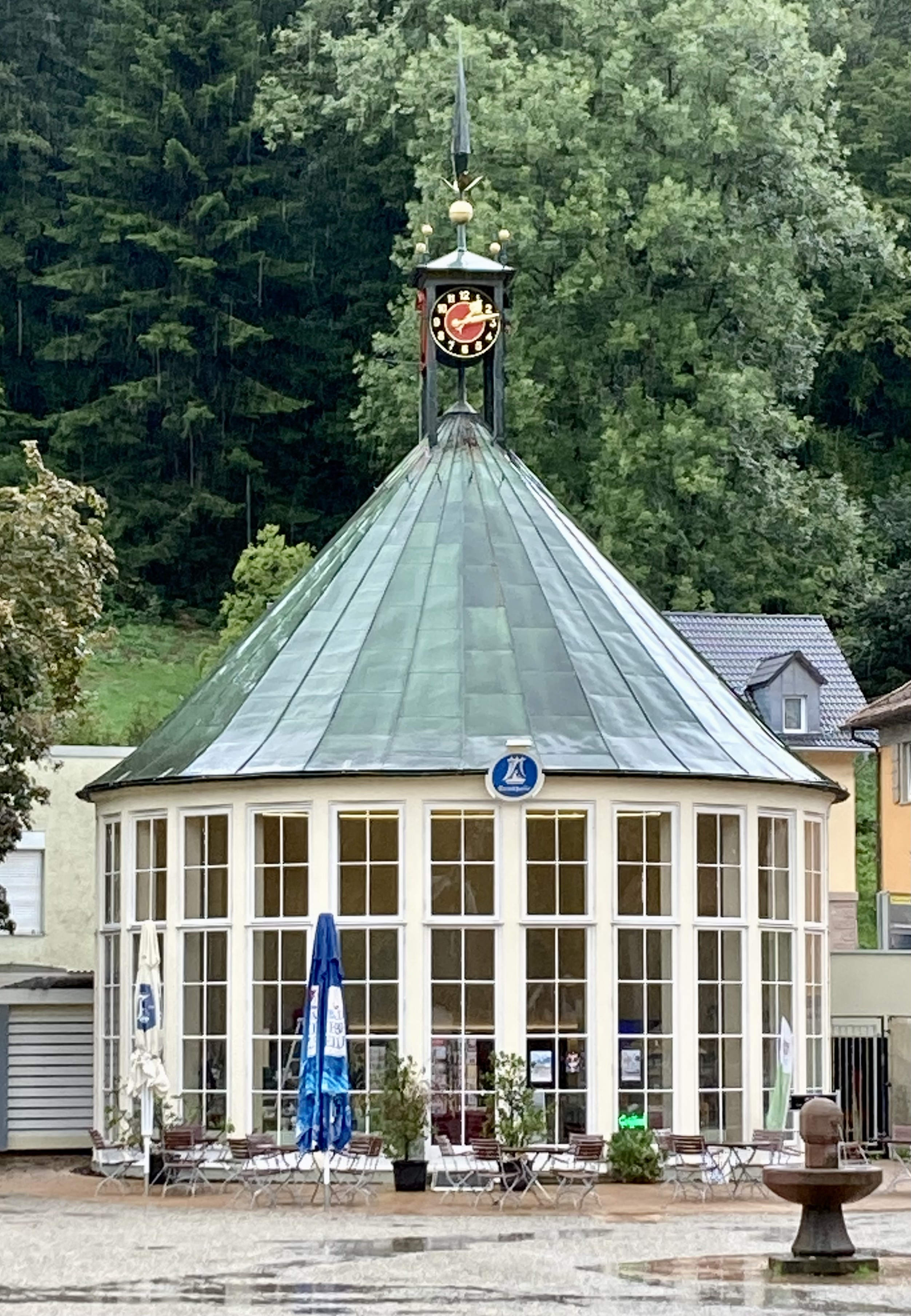 Besonders Bad Liebenzell beeindruckt mit viel Wasser: die Nagold, der Teich mit Riesenregenpfütze davor und die Trinkhalle.