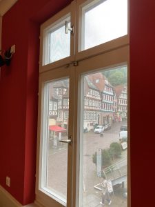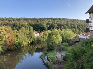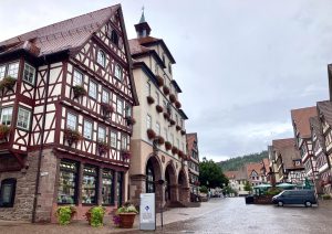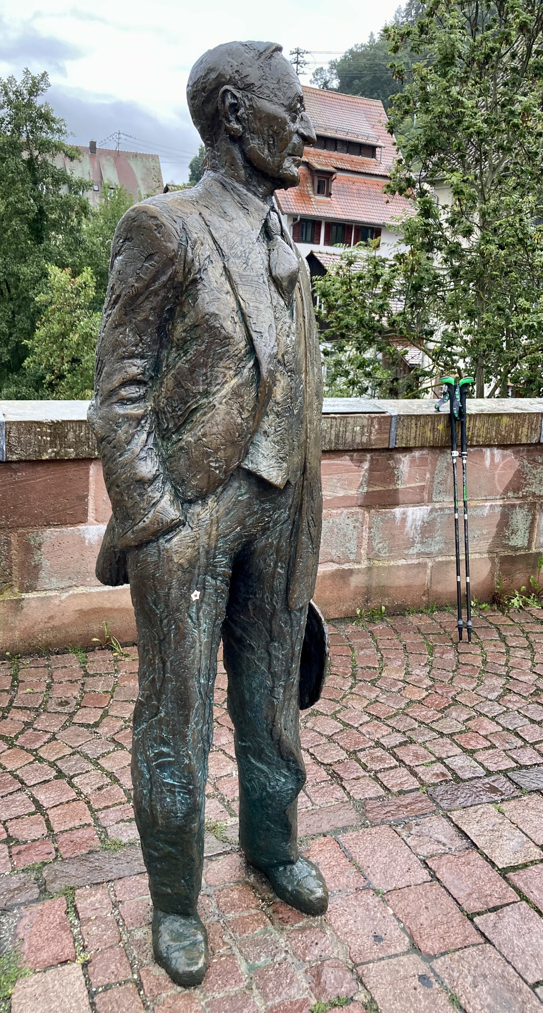 Ich laufe bis nach Calw und würdige Hermann Hesse, den berühmten Sohn der Stadt, mit einem Foto. Vor dem nassen Marktplatz beschließe ich, dass Cappuccino-Trinken noch besser ist als im Regen weiter zu laufen. Schöne Fachwerkhäuser sehe ich auch von hier aus.