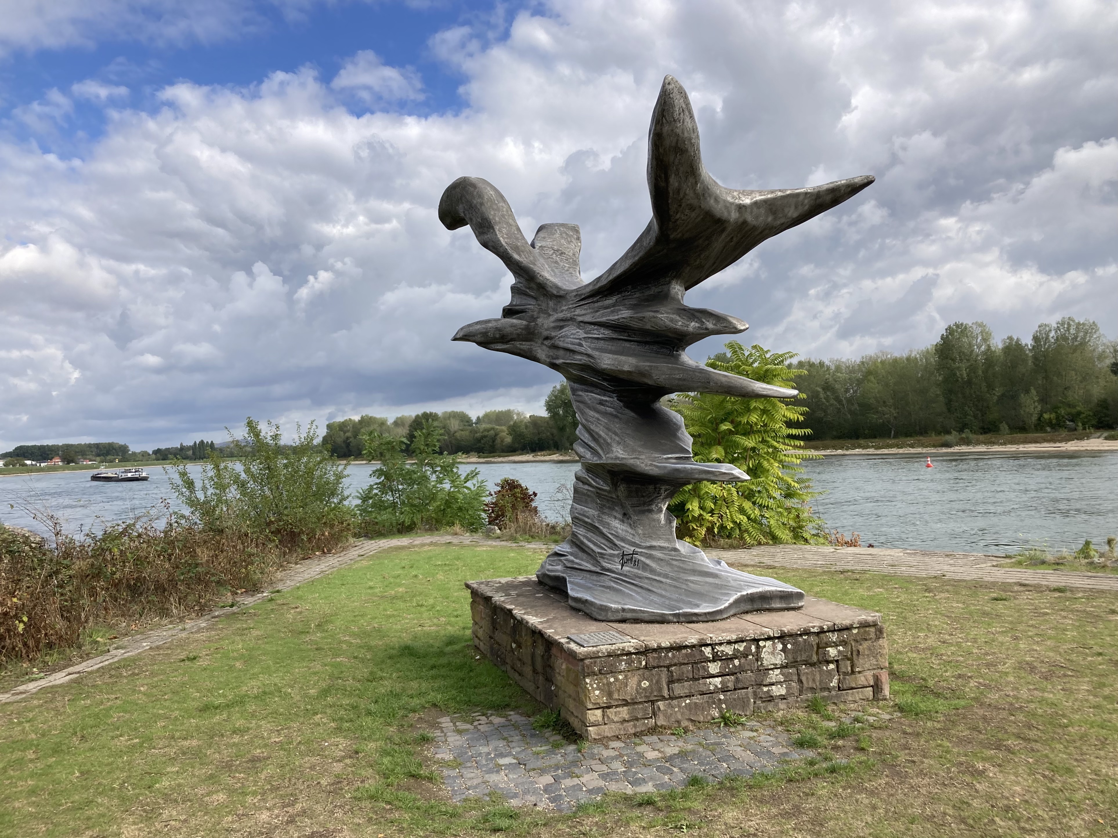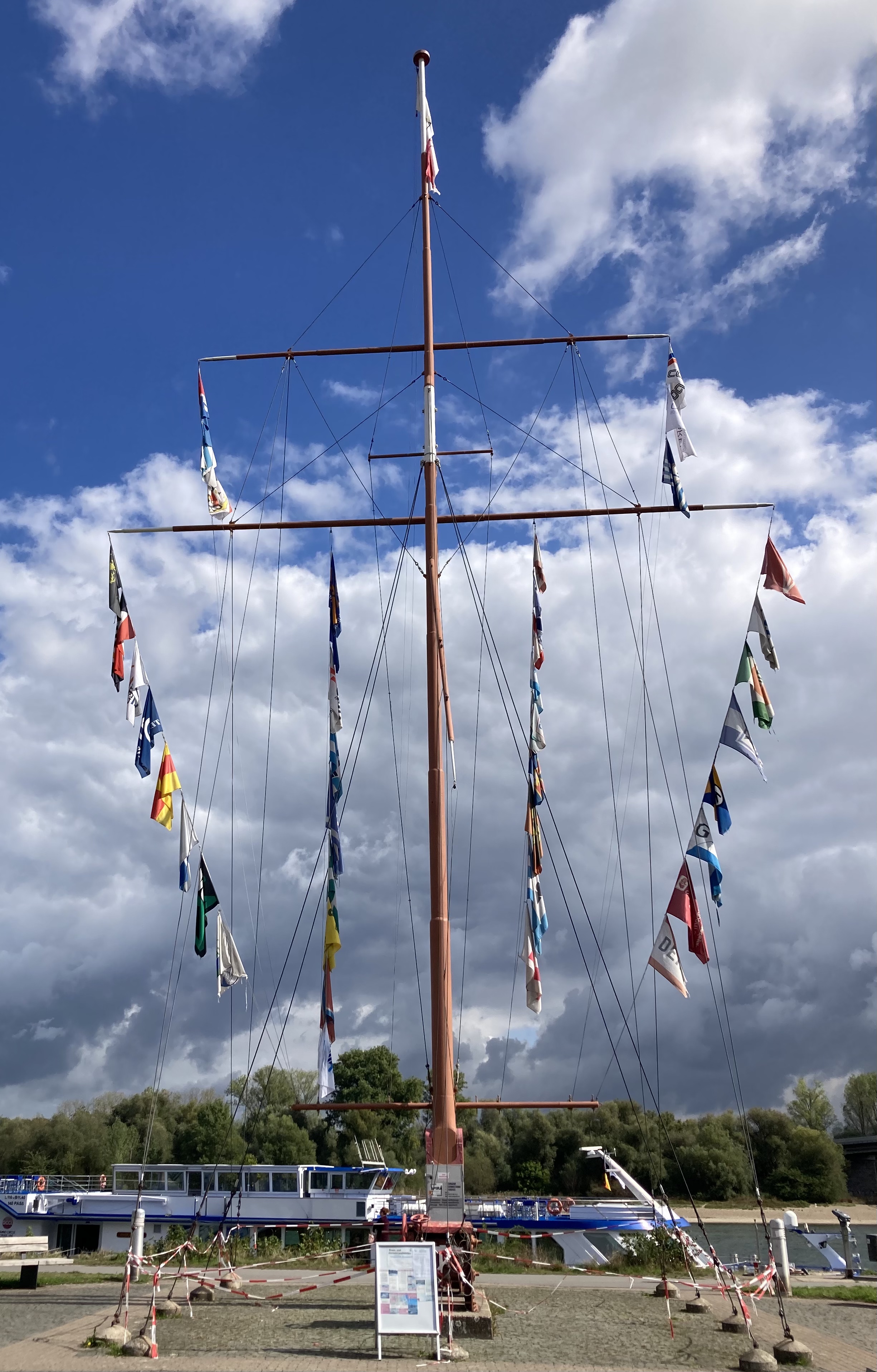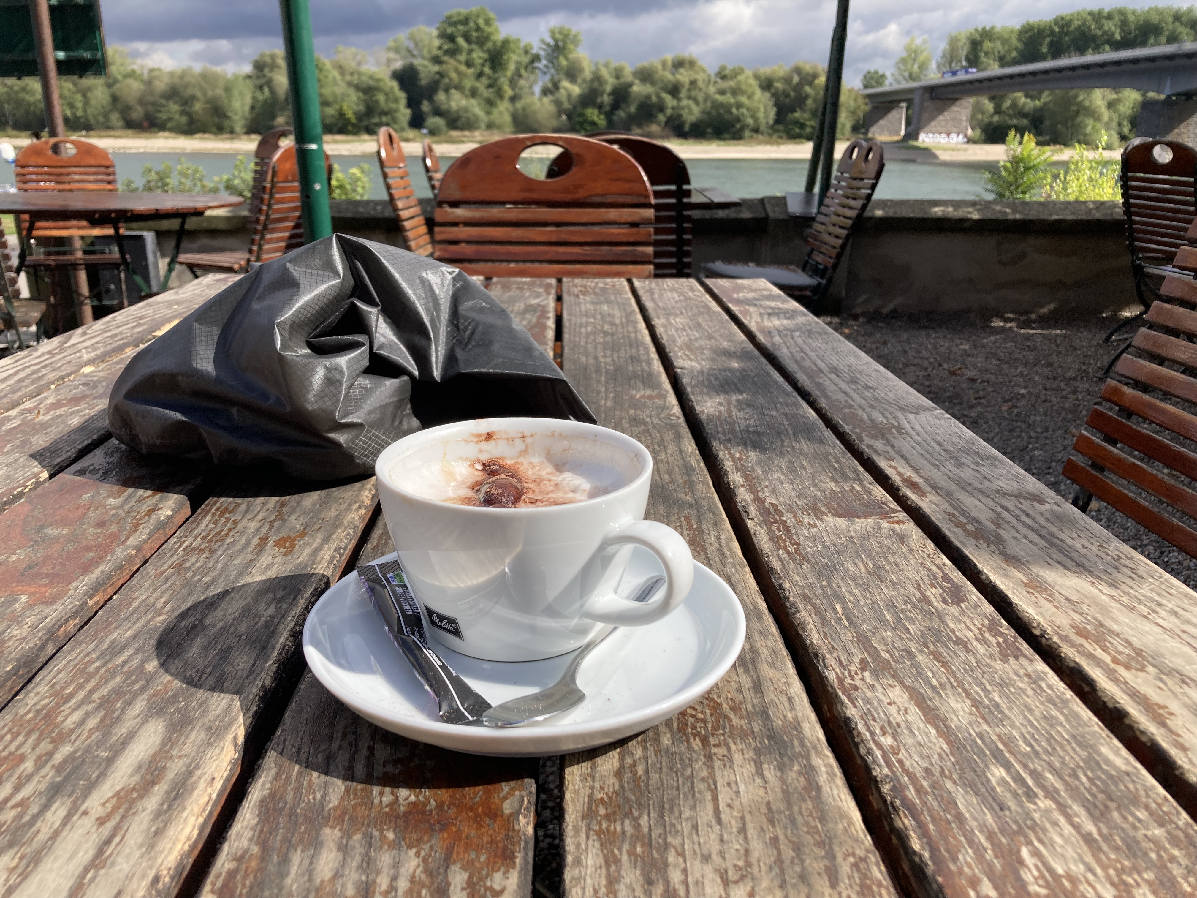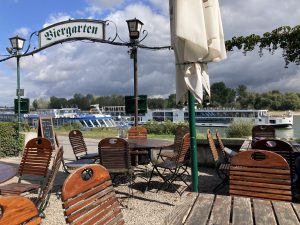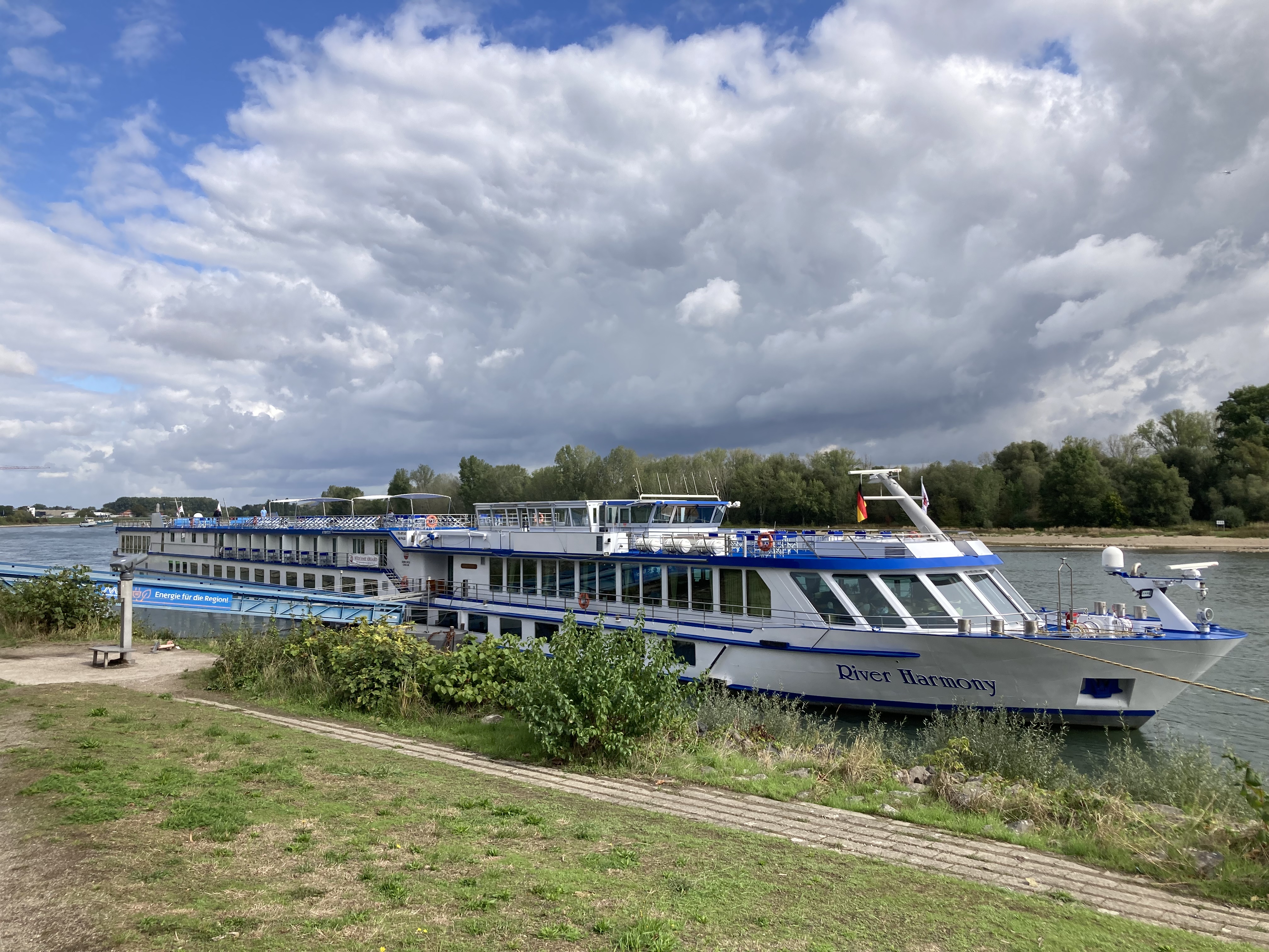 Dann zieht es mich wieder zum Rhein hin, wo ich in einem Biergarten Schiffchen beobachte und Tagebuch schreibe.